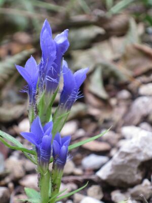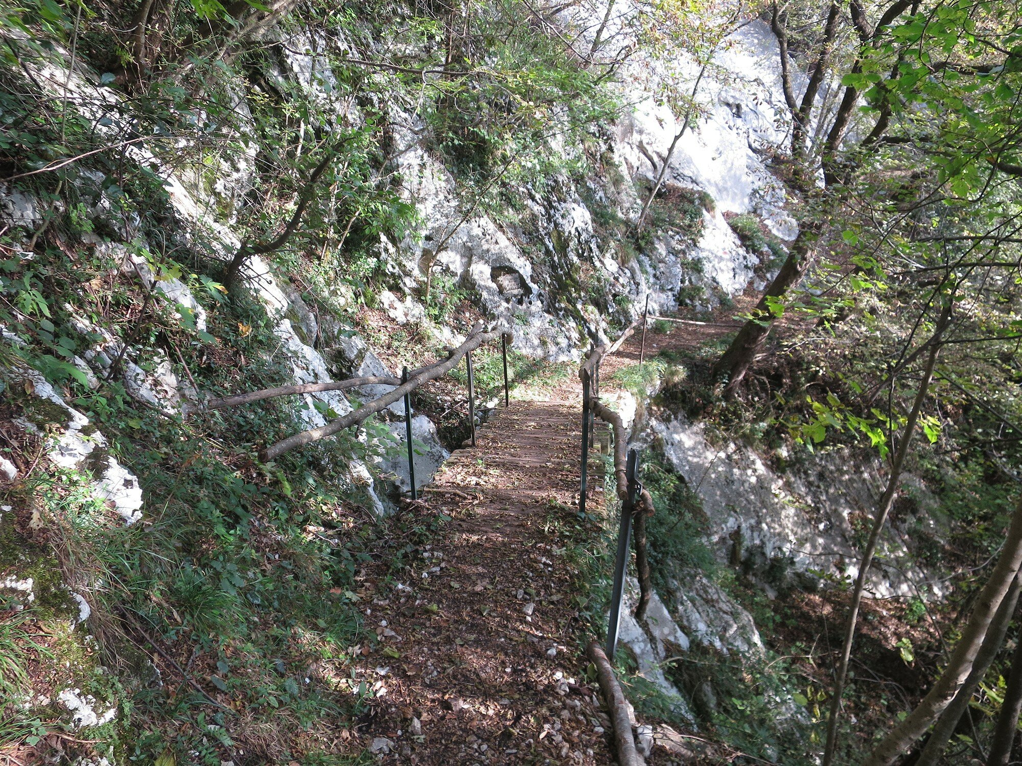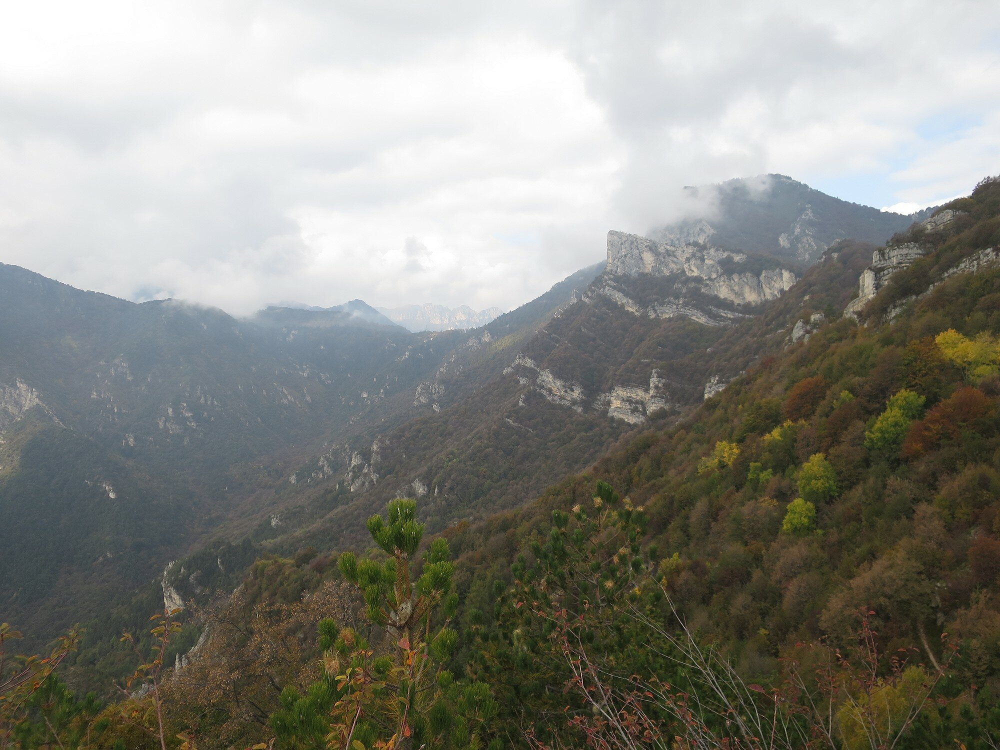 Unsere 2. Wanderung führte uns vom Ufer des Lago di Ledro bis zu einer aussichtsreichen Hütte. Ausgangspunkt der heutigen Rundtour war ein Parkplatz am Ortseingang von Pur (ca. 650 m). Wir liefen anfangs sehr bequem in das Valle di Pur (Weg Nr. 421), später gabelte sich der Weg, wir nahmen den rechten Abzweig (weiterhin Sentiero 421). Nach und nach wurde der Wanderpfad etwas steiler, im unteren Teil liefen wir parallel zu einem Bergbach, im oberen Teil ging es durch felsiges Terrain. Oben angekommen stießen wir auf einen breiten Waldweg, von dort war es nicht mehr weit bis zum Passo Nota (1206 m). Leider war das gleichnamige Rifugio bereits geschlossen. Wir folgten nun einem breiten Weg bis zum Passo Bestana (1270 m, höchster Punkt der Tour), wenig später erreichten wir über einen ehemaligen Kriegsweg die Bocca dei Fortini (1244 m). Hier befanden wir uns bereits oberhalb von Limone – Die Vegetation an den Felsen war schon wieder etwas „südlicher“ angehaucht und teilweise konnten wir auch ein paar Tiefblicke auf den im Dunst liegenden See erhaschen. Von der Bocca d. F. liefen wir in wenigen Minuten bis zu einer kleinen Schutzhütte mit einem idyllischen Rastplatz (Casa Carlotta), welche sehr aussichtsreich unterhalb der Felswände des Monte Carone liegt. Nachdem wir uns ausgiebig gestärkt hatten, ging es in wenigen Minuten zurück zur Bocca. Ab sofort folgten wir für längere Zeit den breiten Weg Richtung Val di Ledro. Der Weg führte uns durch einen wunderschönen Laubwald, im oberen Teil kamen wir an mehreren Unterständen des 1. Weltkrieges vorbei. Der Abstieg war sehr bequem und knieschonend mit nur wenigen steileren Passagen. Auf einer Höhe von ca. 900 Metern erreichten wir eine Lichtung mit einem kleinen Steinhaus (Achtung: Privatgelände). Hier gab es einen Umtrunk mit einem Rotwein aus dem Trentino. Der Einstieg zum unmarkierten Abstieg hinunter nach Pur befand sich nur wenige Meter von diesem Steinhaus entfernt und war nicht zu übersehen. Ein naturnaher Pfad leitete uns bergab, bald kamen wir bei den ersten Ferienhäusern am Ortsrand von Pur an, hier folgten wir wieder die Fahrstraße talauswärts bis zum Parkplatz in Pur.