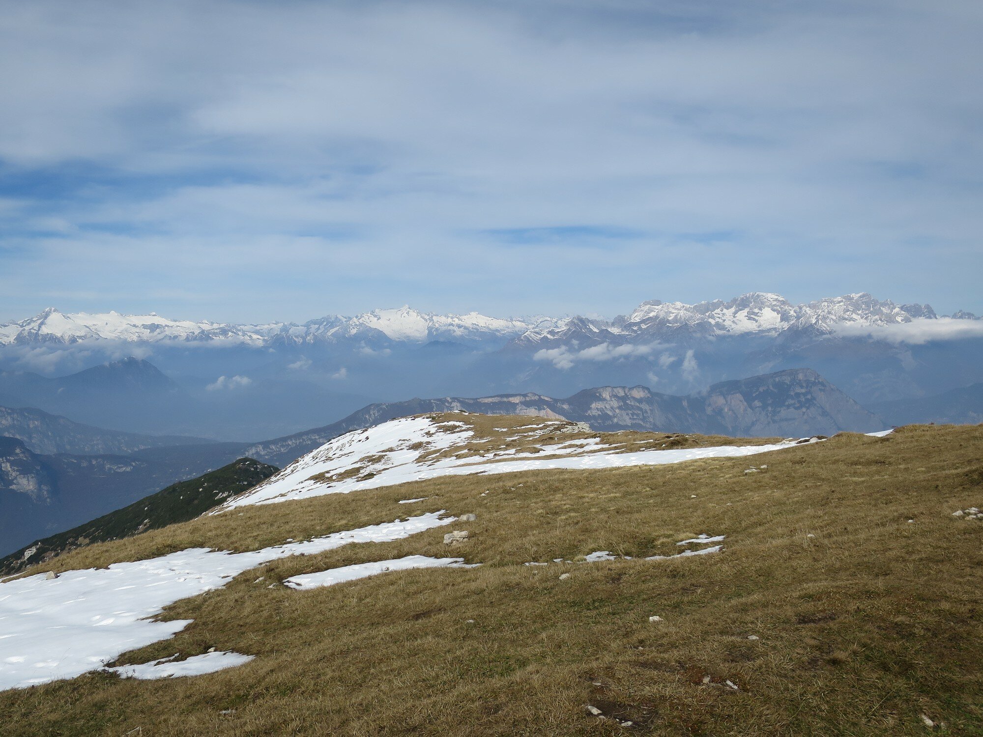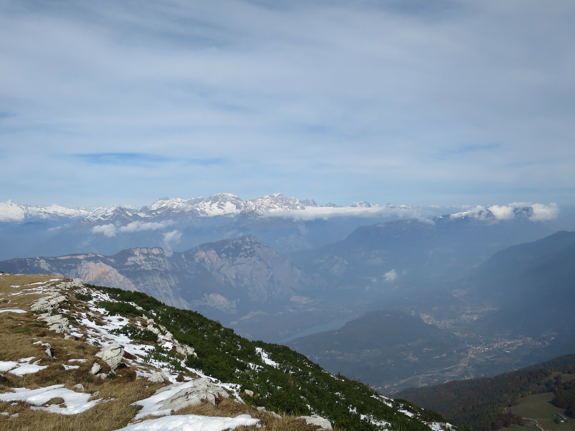 Heute stand schließlich eine Wanderung auf einen höheren Gardaseeberg auf dem Programm: Gemeinsam ging es auf den 2059 Meter hohen Monte Stivo. Dieser herrliche Aussichtsberg liegt nord(östlich) vom Gardasee und bietet aufgrund seiner Höhe von über 2000 Metern eine sehr gute Fernsicht. Anreise auf einer serpentinenreichen und schmalen Bergstraße bis zum Passo S. Barbara. Anfangs gemächliches Wandern entlang eines Fahrweges, der später in angenehmen Serpentinen bis zum Almboden La Prese anstieg – Hier erreichten wir die Baumgrenze. Weiterer Aufstieg bis zur Alm Malga Stivo entlang eines breiten Schotterpfades. Letztes Stück bis zum Gipfel und zum (aktuell geschlossenen) Refugio auf einem Bergpfad. Aufgrund von Neuschnee war der Weg teilweise etwas rutschig und matschig. Am Gipfel hatten wir eine phänomenale Rundumsicht über den gesamten Gardasee und zu den Bergen des Trentinos – Der Blick schweifte hinunter auf dem im Dunst liegenden Gardasee, ebenso zu den hohen Bergen der Brenta- und Adamello-Gruppe. Aufgrund des kalten Windes machten wir unsere Pause auf der Terrasse des Refugios. Danach ging es auf gleichem Wege zurück bis La Prese. Hier nahmen wir den rechten Abzweig bis Castil (Reste einer Burgruine), Abstieg bis zu den Wiesen von Malga Zanga. Beim mittlerweile geschlossenen Malga Castil gab es einen Umtrunk mit einem lokalen Rotwein. Auf breiten und unmarkierten Wegen ging es zurück bis zum Passo S Barbara.