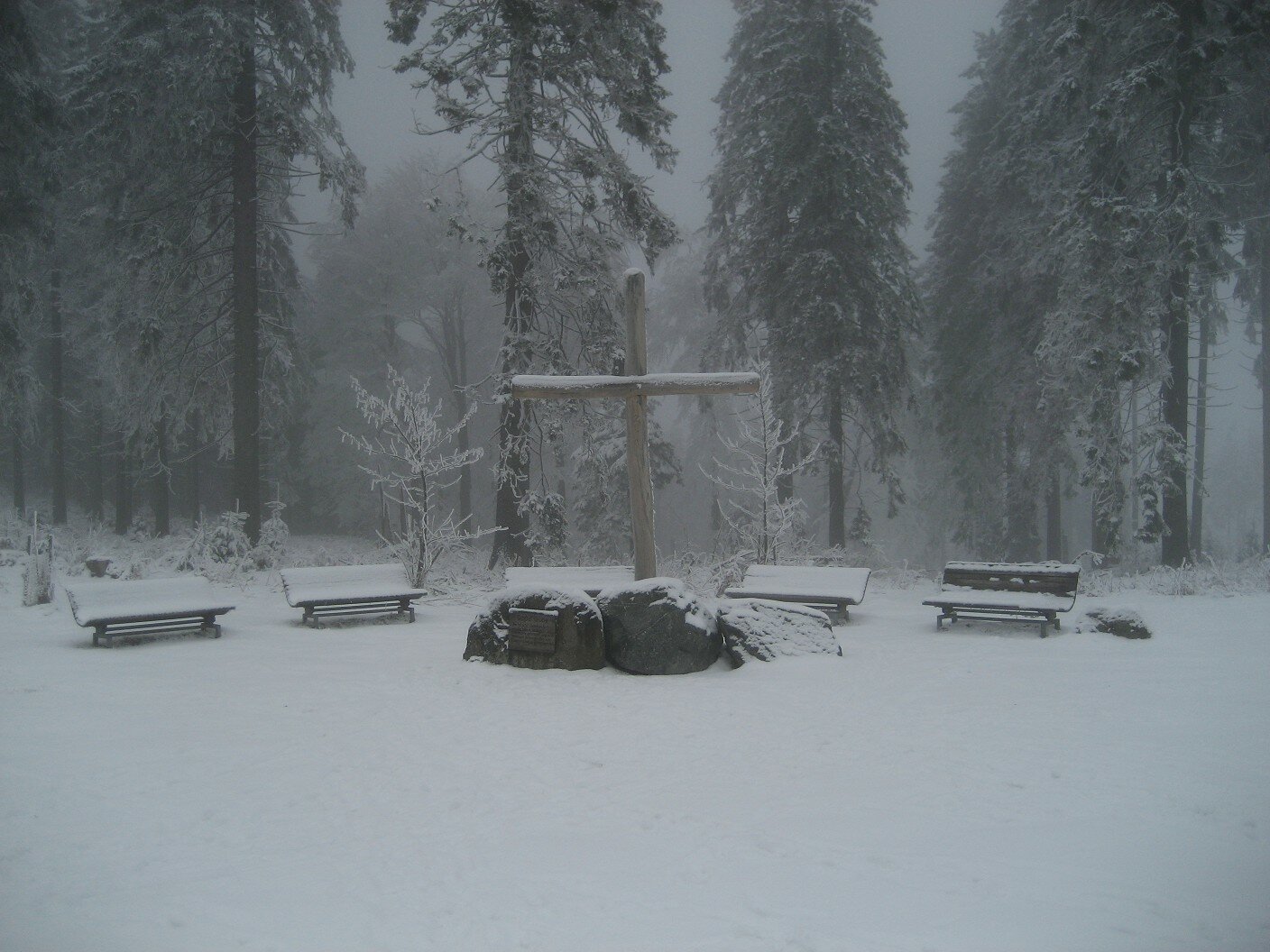 Am Samstag, 22.01. fand nun endlich die langersehnte Besteigung eines weiteren Bundeslandhöhepunktes statt: Unter Führung eines örtlichen Führers bestiegen wir gemeinsam den Langenberg (843 m). Nach einem üppigen Frühstück fuhren wir zum Craft-Shop (www.craftshop-willingen.de), wo uns bereits der Inhaber Klaus Pollack und seine Hündin Chica (Name hoffentlich richtig geschrieben) erwarteten. Nach dem Anpassen der Schneeschuhe ging es mit den PKW´s bis an den oberen Ortsrand von Willingen. Hier ließen wir unsere Autos stehen und liefen einen breiten Waldweg (Zugangsweg v. Rothaarsteig) bergauf, für die Schneeschuhe lag hier allerdings noch zu wenig Schnee. Nach Erreichen d. Uplandsteiges folgten wir seiner Beschilderung bis zum Richtplatz, der auf einer großen Lichtung (größtenteils d. Sturm Kyrill verursacht) liegt. Kurz danach konnten wir die Schneeschuhe anlegen und folgtem dem Wanderweg Richtung Langenberg. An den Bäumen entdeckten wir zahlreiche Schneekristalle mit ihrer reizvollen Feinstruktur. Kurz vor dem „Dach von NRW“ verzögerte Klaus allerdings den Gipfeltriumph und lief mit uns durch eine frisch verschneite Waldschneise. Danach ging es aber nicht mehr lange bis zum höchsten Punkt von Nordrhein-Westfalen. Auf dem Langenberg befindet sich ein Gedenkstein und seit 2010 sogar ein Gipfelkreuz und eine Raststelle. Nun war natürlich Zeit für einen Gipfelsekt und das obligatorische Gruppenbild mit NRW-Fahne. Der Eintrag in das Gipfelbuch durfte natürlich auch nicht fehlen. Über einen breiten Waldweg kamen wir bald wieder beim breiten Zugangsweg an, den wir wieder bergab zum Ausgangspunkt folgten. Nach einer Strecke von ca. 6,5 Kilometern kamen wir wieder bei unseren Autos an.