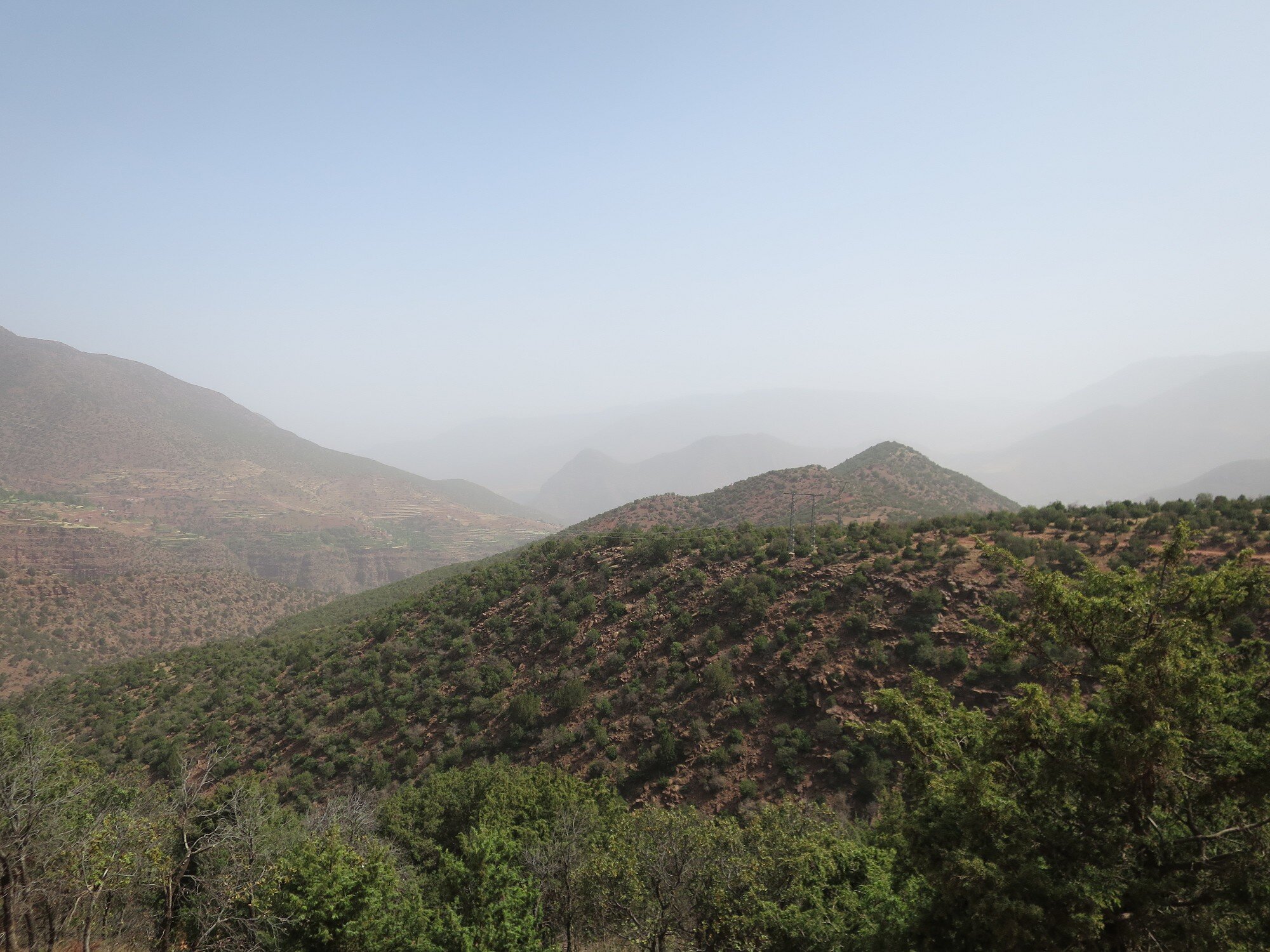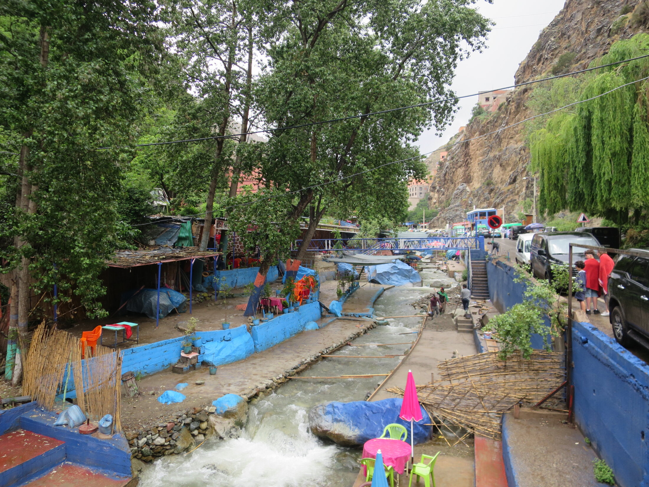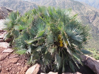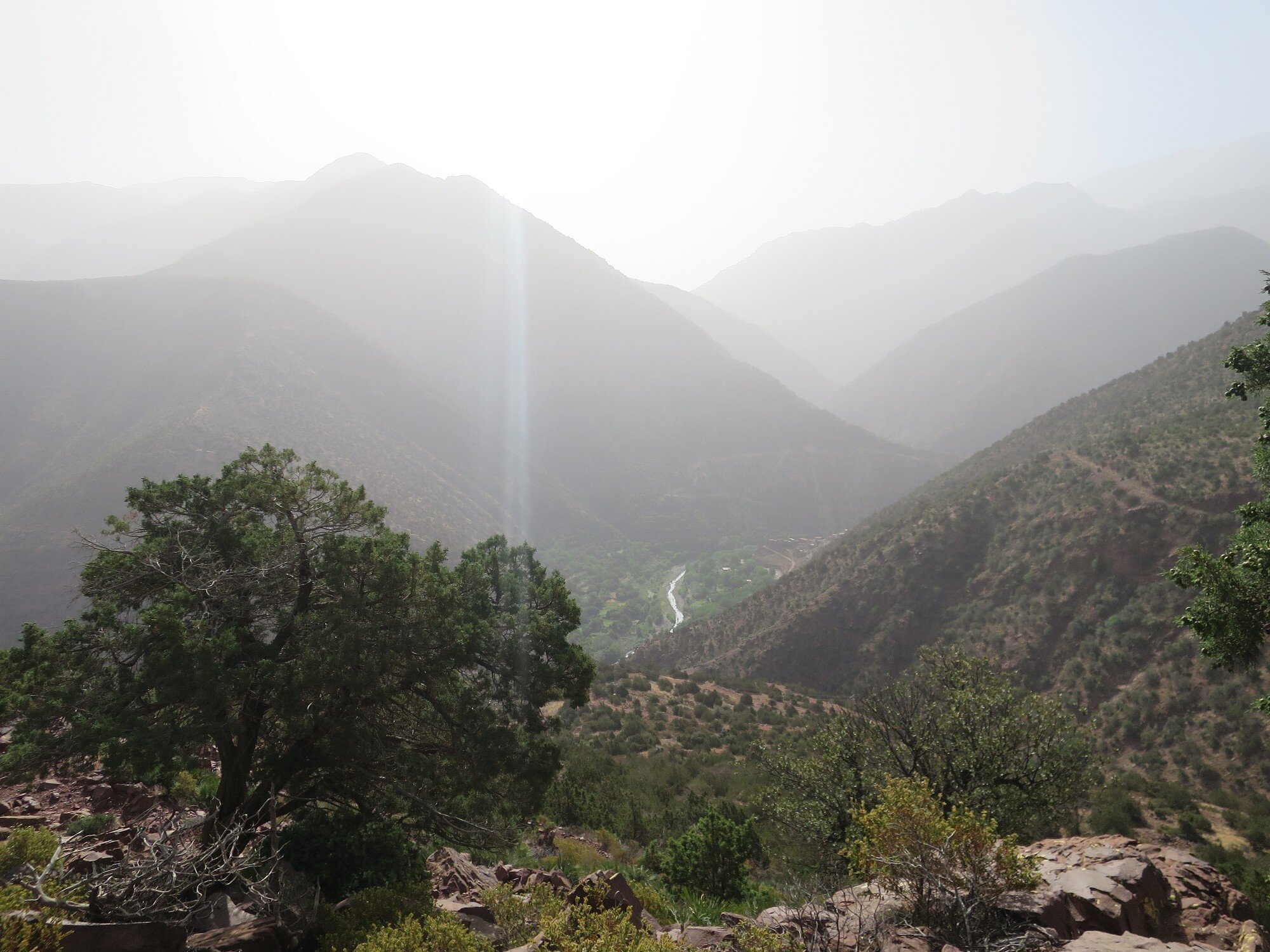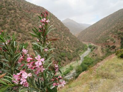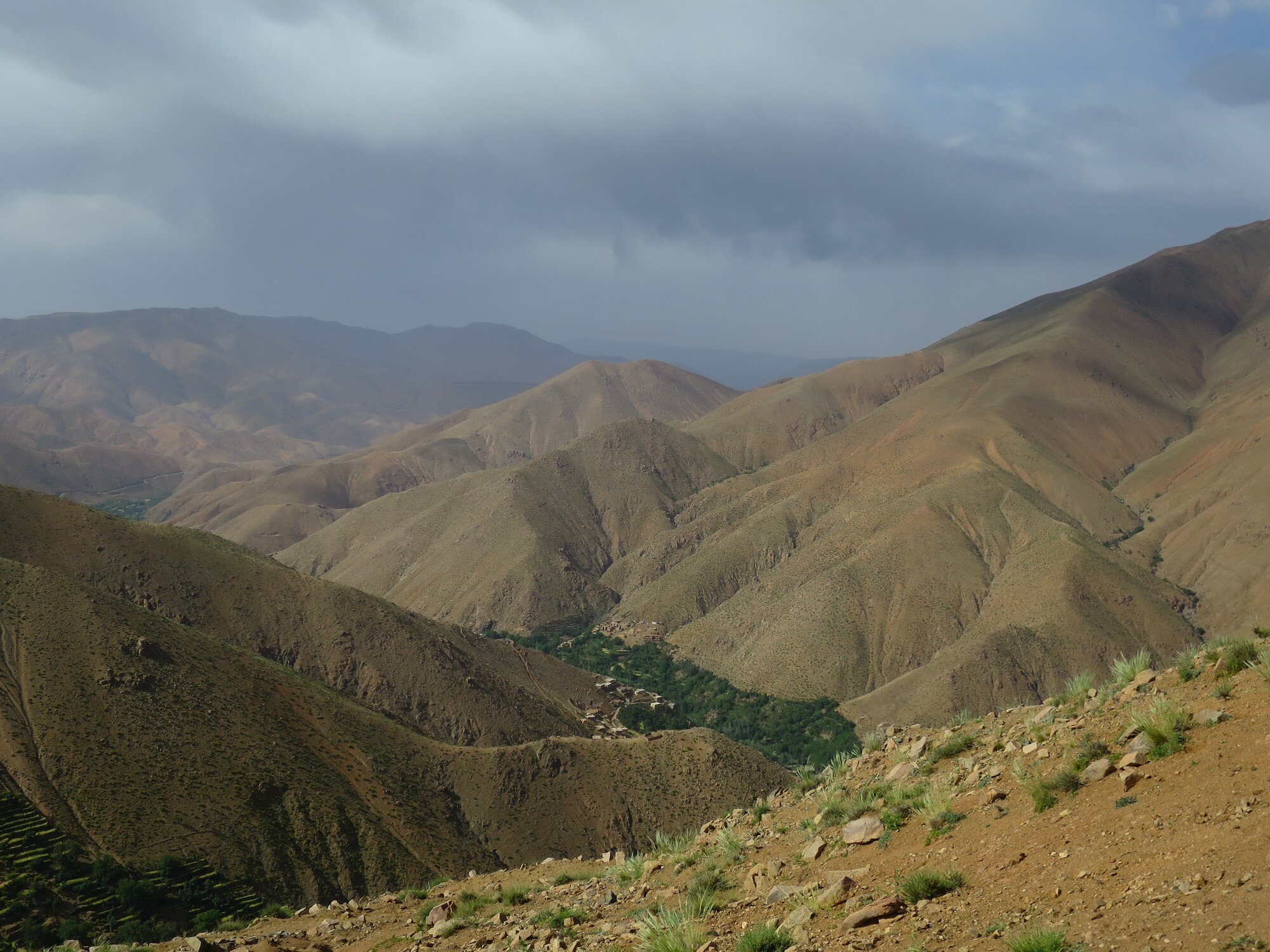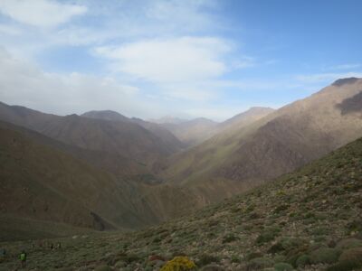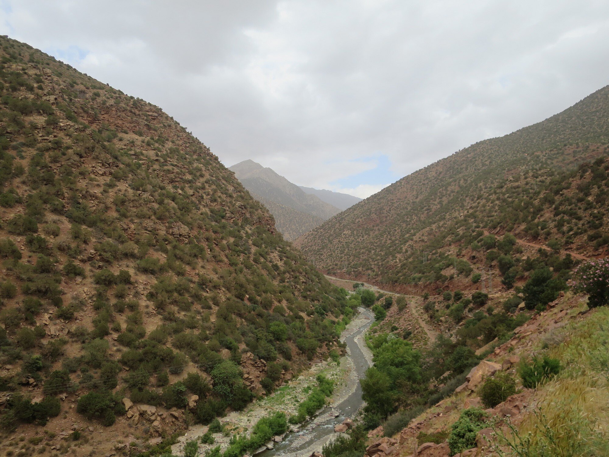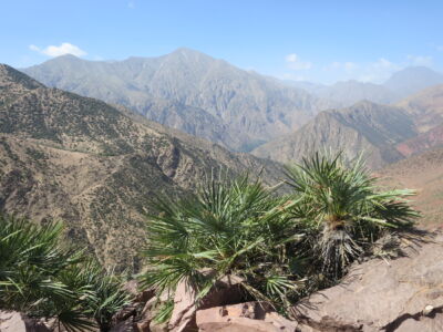 Vom Lagerplatz ging es parallel entlang einer tief eingeschnittenen Schlucht. Wir gelangten sehr aussichtsreich zum Tizi n’Igrane (2.000 m), von wo aus wir eine phantastische Aussicht auf kleine, sich an die Berghänge schmiegende, Berberdörfer mit aus rosa und rotem Stein errichteten Häusern und dem Ourika-Tal hatten. An den Hängen entdeckten wir unzählige Zwergpalmen und natürlich weitere botanische Kostbarkeiten. Der Abstieg hinunter ins Ourika-Tal war vor allem im unteren Teil aufgrund der Schwüle sehr schweißtreibend. Wir erreichten den Flusslauf in der Nähe des Wallfahrtortes Setti Fatma – Der ideale Platz für ein leckeres Mittagsessen. Doch nun brauten sich über uns immer mehr Gewitter zusammen. Mit viel Glück konnten wir noch unser Mittagessen zu uns nehmen. Danach fuhren wir mit einem Sammeltaxi in den Ortskern. Die teilweise extremen Regengüsse überbrückten wir in einem Restaurant bei einem Glas Tee oder frischgepressten Orangensaft. Langsam wurde der Niederschlag moderater und wir wanderten danach in ca. 20 Minuten zu unserer heutigen Unterkunft, einer landestypischen Gîte d’Etape zwischen S. Fattma und Ait Boulmane gelegen.