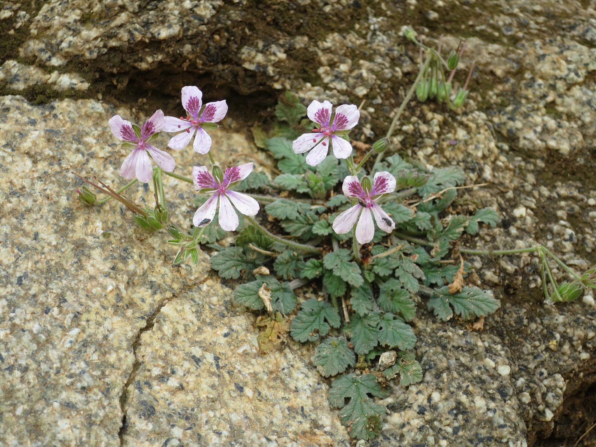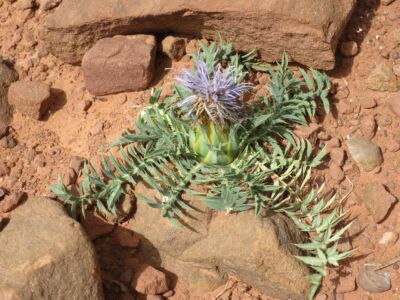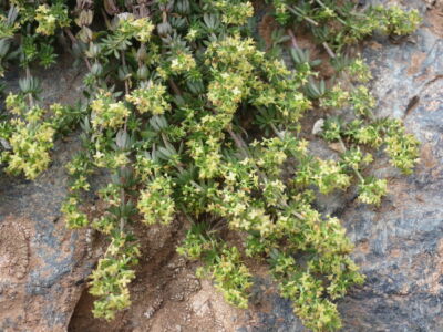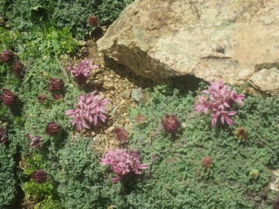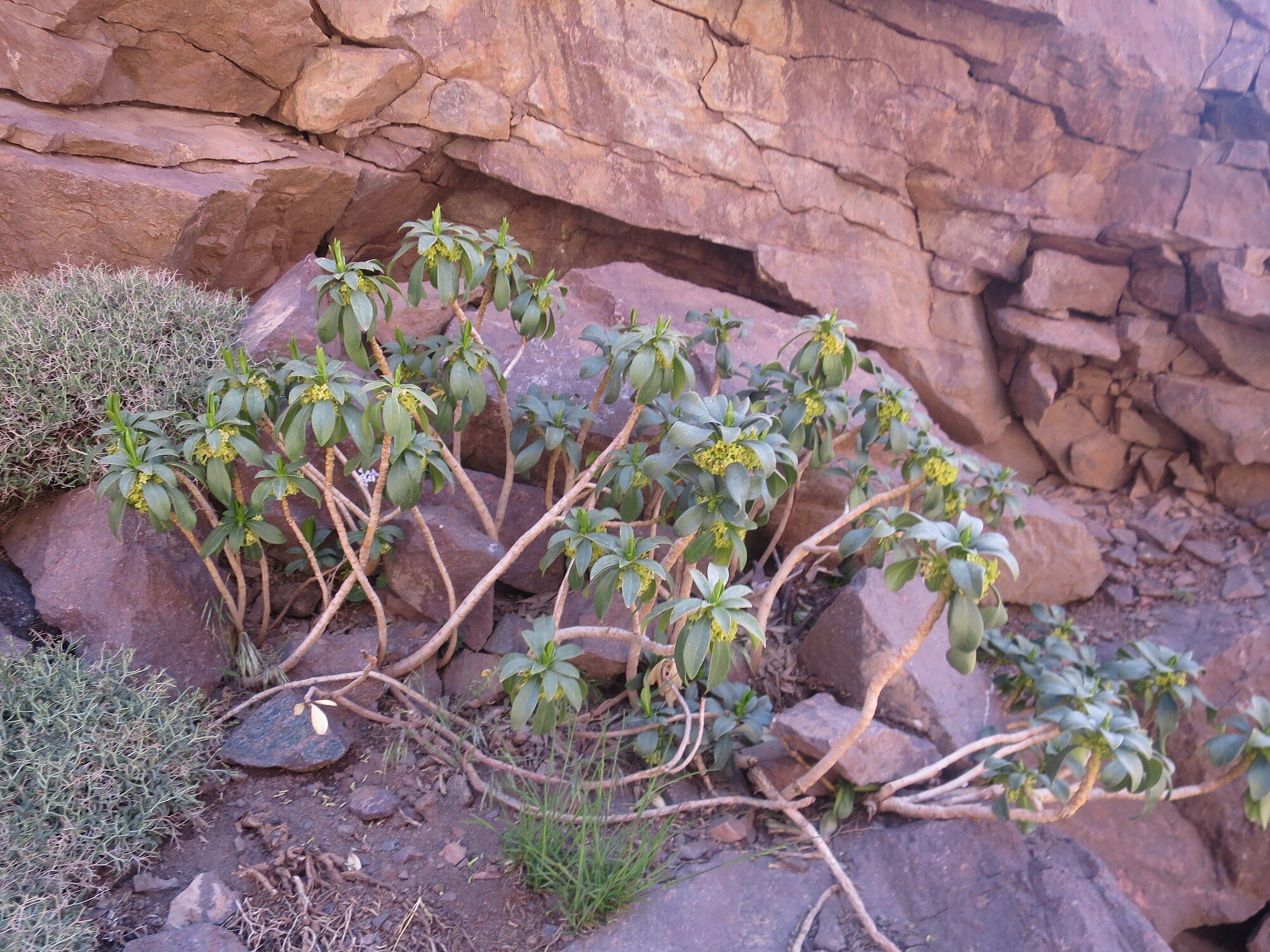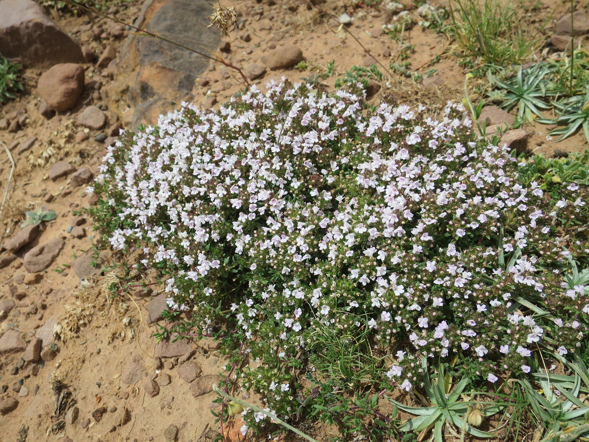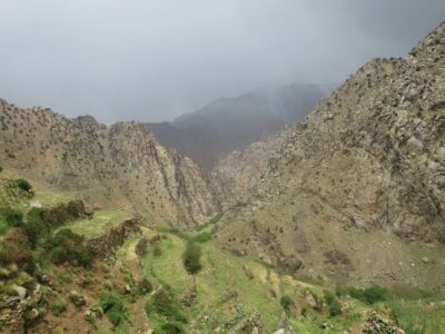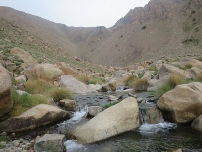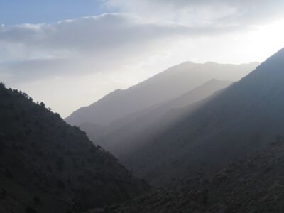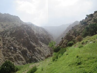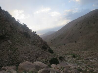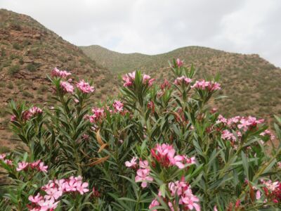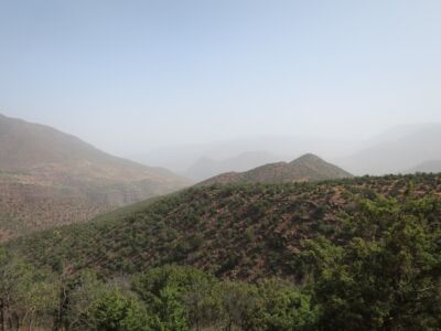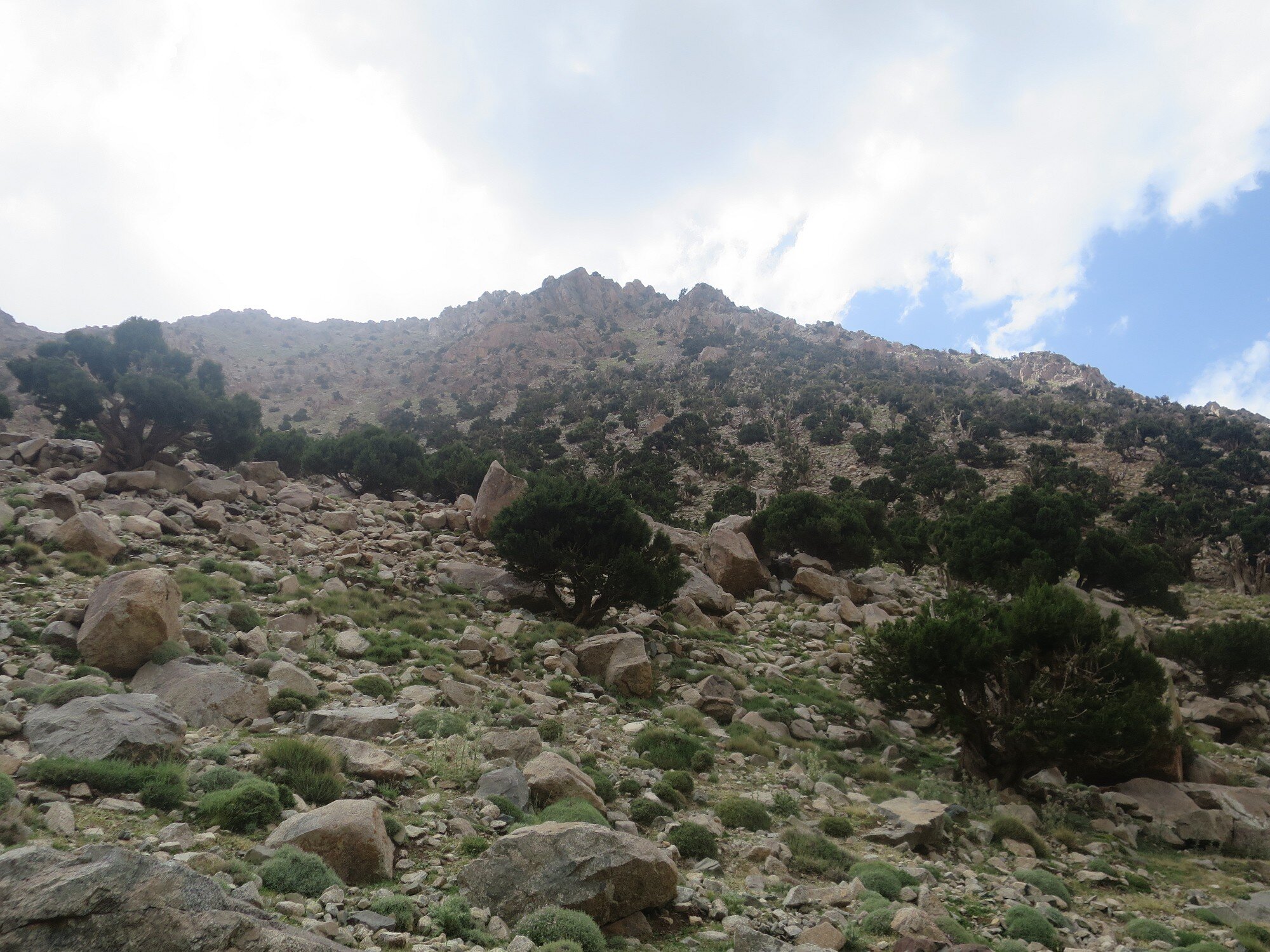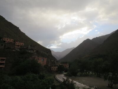 Vom Lagerplatz ging es parallel entlang einer tief eingeschnittenen Schlucht. Wir gelangten sehr aussichtsreich zum Tizi n’Igrane (2.000 m), von wo aus wir eine phantastische Aussicht auf kleine, sich an die Berghänge schmiegende, Berberdörfer mit aus rosa und rotem Stein errichteten Häusern und dem Ourika-Tal hatten. An den Hängen entdeckten wir unzählige Zwergpalmen und natürlich weitere botanische Kostbarkeiten. Der Abstieg hinunter ins Ourika-Tal war vor allem im unteren Teil aufgrund der Schwüle sehr schweißtreibend. Wir erreichten den Flusslauf in der Nähe des Wallfahrtortes Setti Fatma – Der ideale Platz für ein leckeres Mittagsessen. Doch nun brauten sich über uns immer mehr Gewitter zusammen. Mit viel Glück konnten wir noch unser Mittagessen zu uns nehmen. Danach fuhren wir mit einem Sammeltaxi in den Ortskern. Die teilweise extremen Regengüsse überbrückten wir in einem Restaurant bei einem Glas Tee oder frischgepressten Orangensaft. Langsam wurde der Niederschlag moderater und wir wanderten danach in ca. 20 Minuten zu unserer heutigen Unterkunft, einer landestypischen Gîte d’Etape zwischen S. Fattma und Ait Boulmane gelegen.