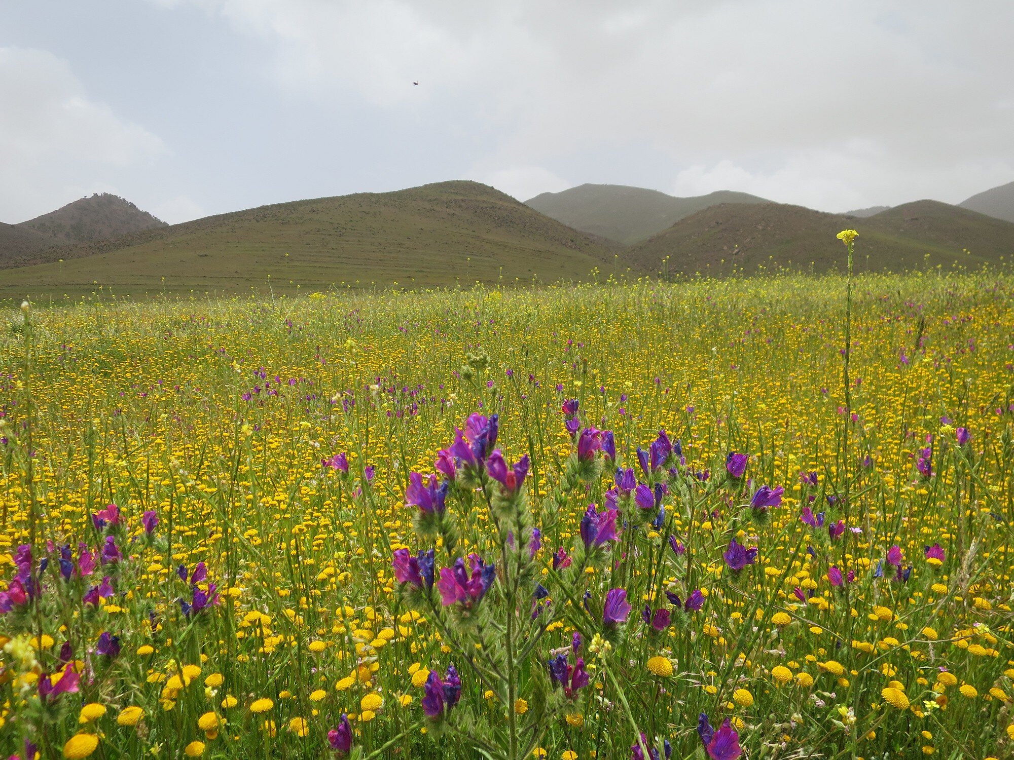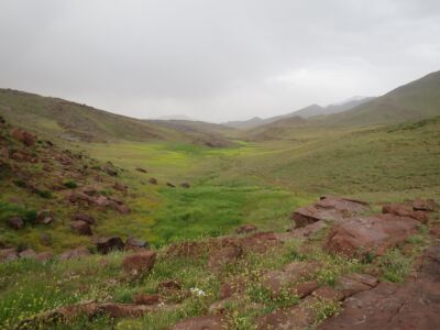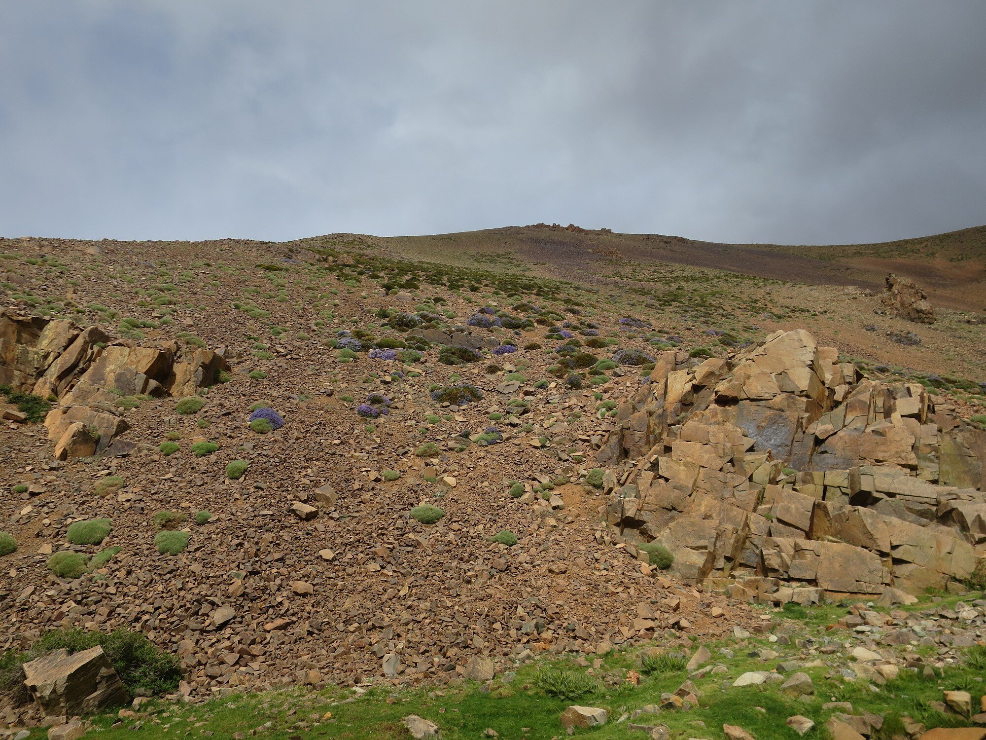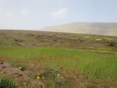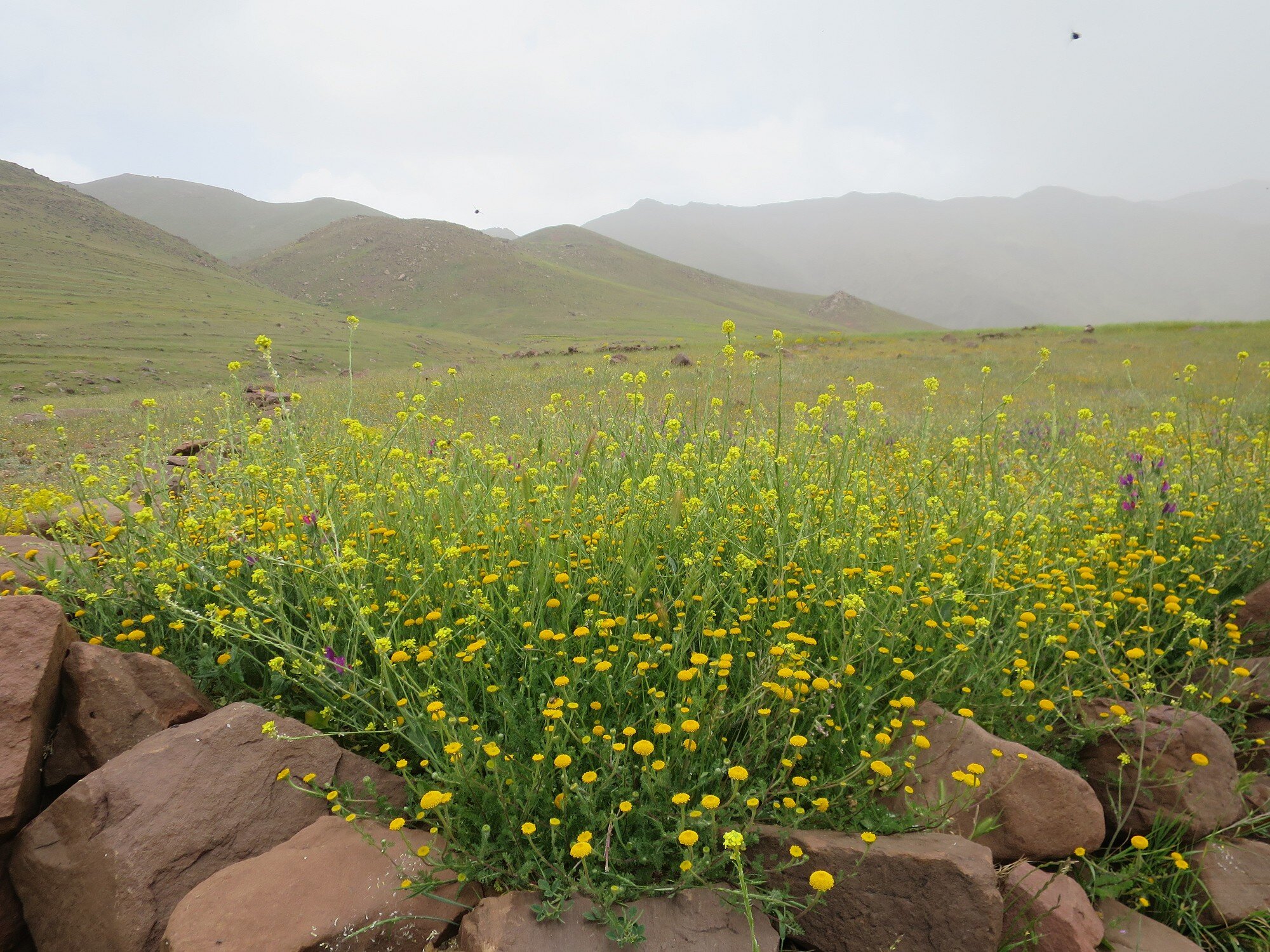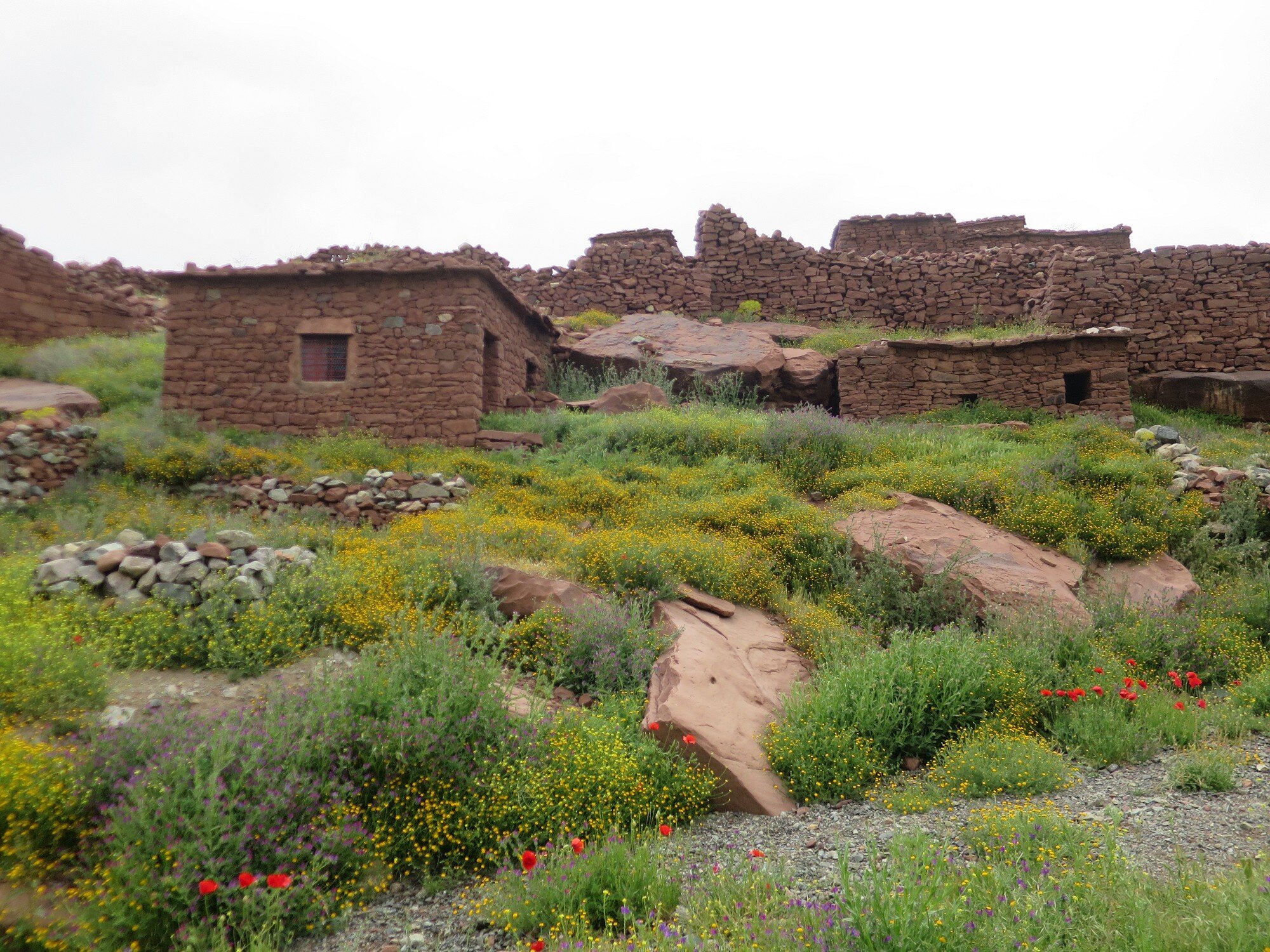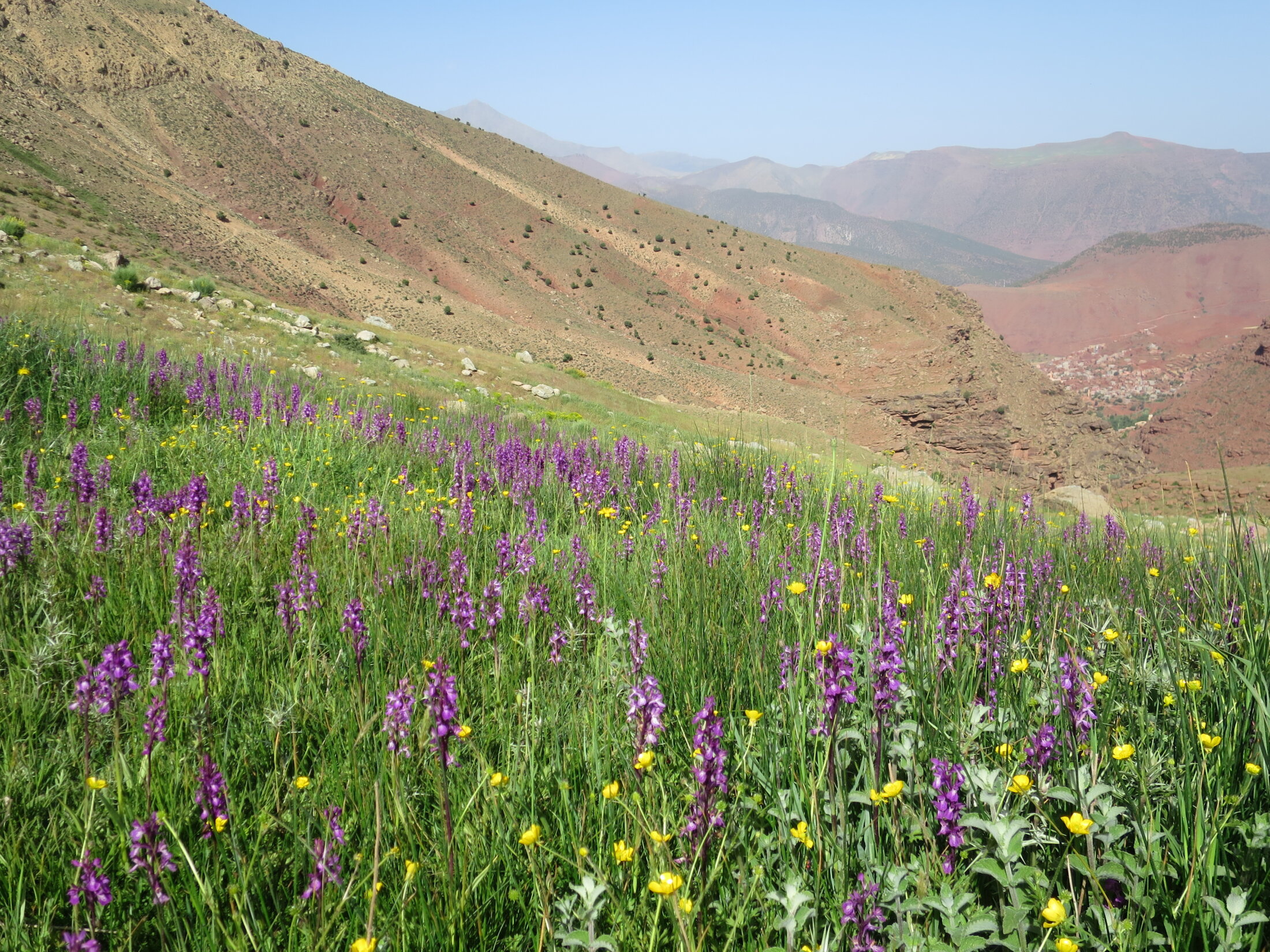 Kurz danach erreichten wir das Dorf Ouarzazt, wo das weitläufige Yagour-Plateau beginnt. Es dient den Nomaden der Umgebung als Sommerweide für ihre Tiere. Leider sind die prähistorischen Felsgravuren, die von der frühen Besiedelung dieses Ortes Zeugnis ablegen, mittlerweile durch Vandalismus zerstört. Auf dem Hochplateau erwartete uns eine sehr üppige Pflanzenwelt – Unzählige Pflanzenpolster, selbst Orchideen und diverse Liliengewächse. Mit dieser reichhaltigen Vegetation hätte keiner von uns im Hohen Atlas gerechnet. Zakaria erläuterte uns, dass der vergangene Winter auch relativ reich an Niederschlägen war. Leider zogen nun die ersten dunklen Wolken auf – Den ersten großen Regenschauer überstanden wir während unserer Mittagspause unter einem großen Nussbaum. Hier erwartete uns ein lecker zubereitetes Mittagsessen. Danach mussten wir weiterziehen – Es ging weiter durch ein üppig grünes Hochtal mit einer immensen Blumenpracht – Leider wurden wir auch immer wieder von leichten Regenschauern begleitet. Der Starkregen und die vereinzelten Gewitter blieben glücklicherweise in den höheren Bergen hängen.
