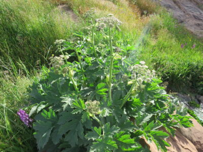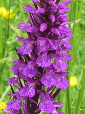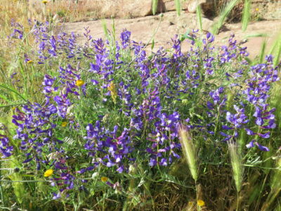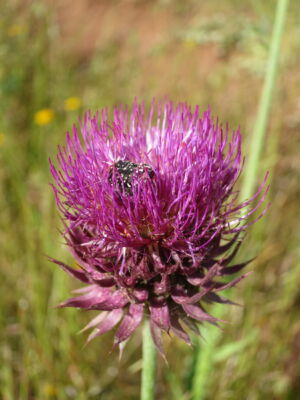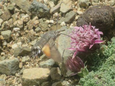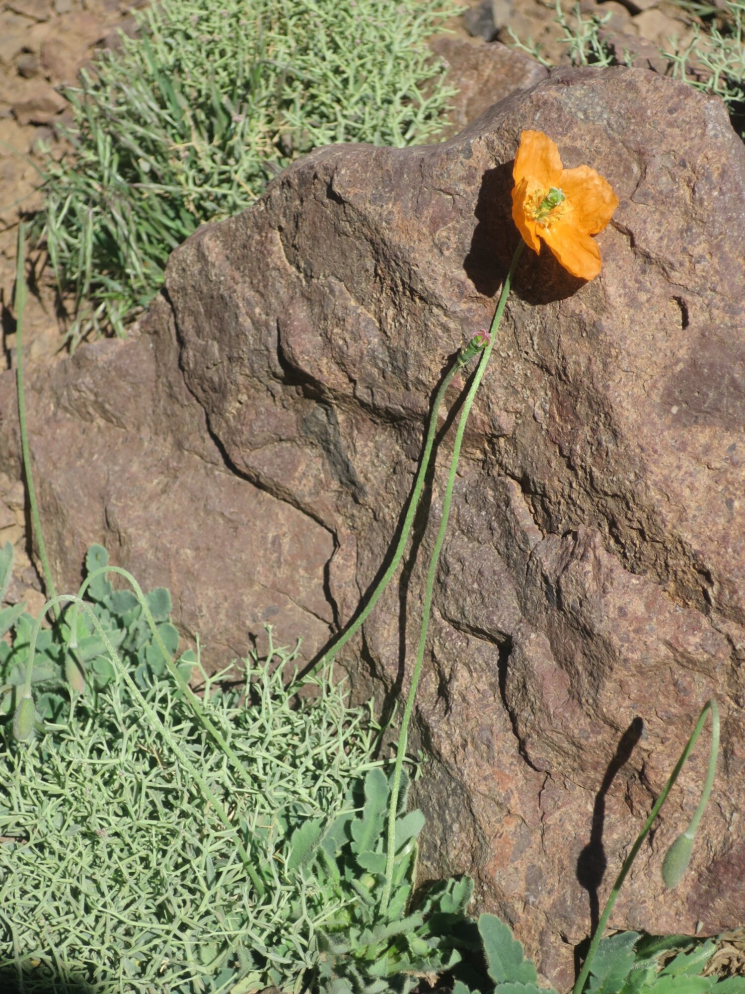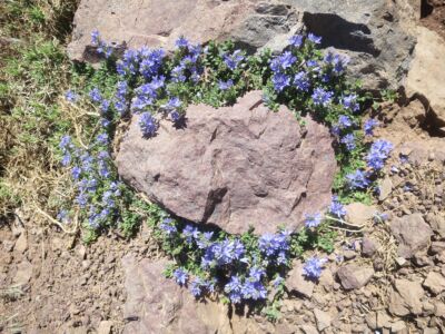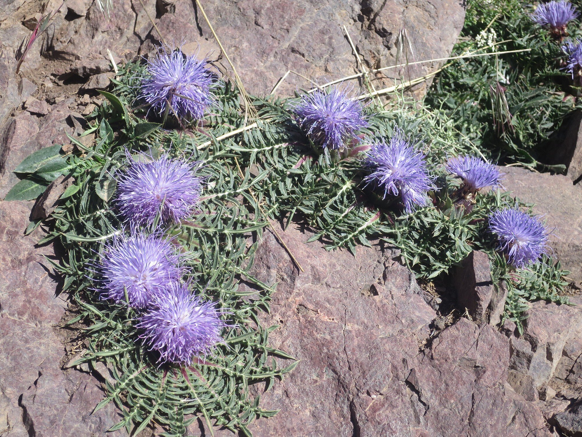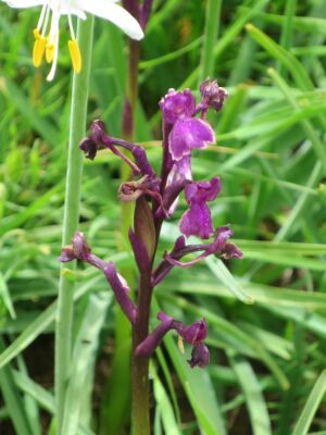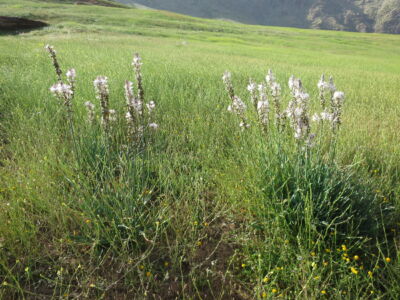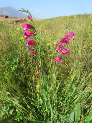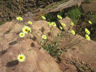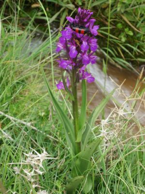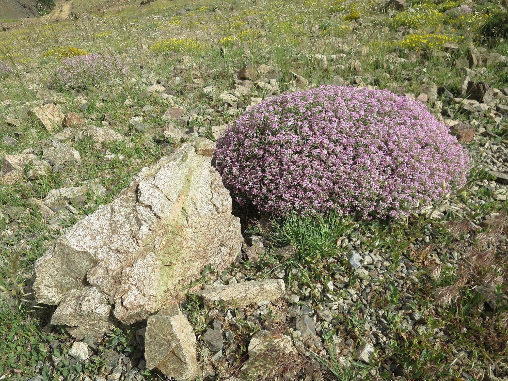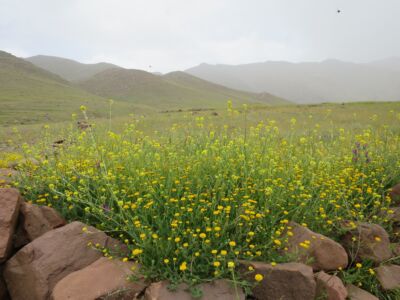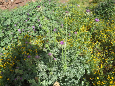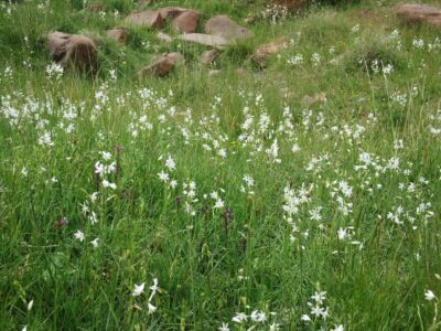 Kurz danach erreichten wir das Dorf Ouarzazt, wo das weitläufige Yagour-Plateau beginnt. Es dient den Nomaden der Umgebung als Sommerweide für ihre Tiere. Leider sind die prähistorischen Felsgravuren, die von der frühen Besiedelung dieses Ortes Zeugnis ablegen, mittlerweile durch Vandalismus zerstört. Auf dem Hochplateau erwartete uns eine sehr üppige Pflanzenwelt – Unzählige Pflanzenpolster, selbst Orchideen und diverse Liliengewächse. Mit dieser reichhaltigen Vegetation hätte keiner von uns im Hohen Atlas gerechnet. Zakaria erläuterte uns, dass der vergangene Winter auch relativ reich an Niederschlägen war. Leider zogen nun die ersten dunklen Wolken auf – Den ersten großen Regenschauer überstanden wir während unserer Mittagspause unter einem großen Nussbaum. Hier erwartete uns ein lecker zubereitetes Mittagsessen. Danach mussten wir weiterziehen – Es ging weiter durch ein üppig grünes Hochtal mit einer immensen Blumenpracht – Leider wurden wir auch immer wieder von leichten Regenschauern begleitet. Der Starkregen und die vereinzelten Gewitter blieben glücklicherweise in den höheren Bergen hängen.