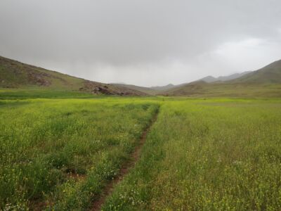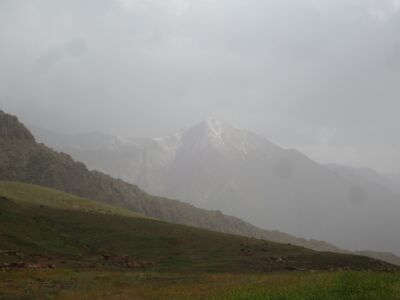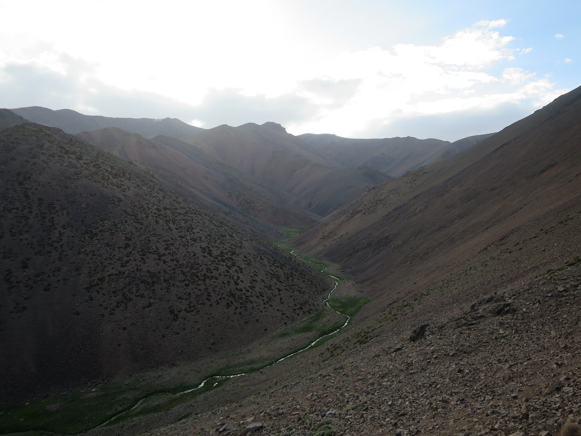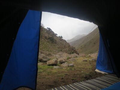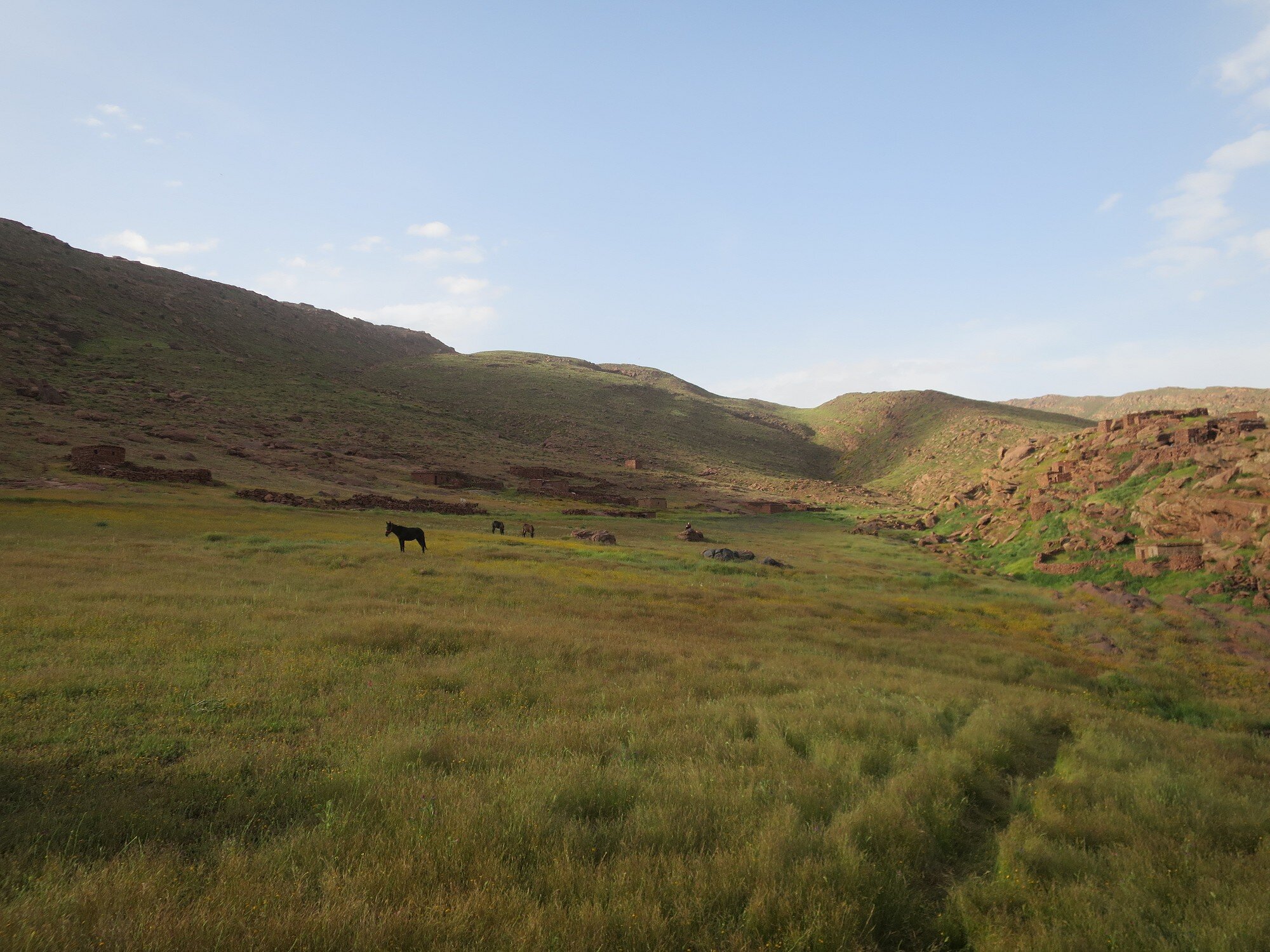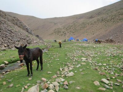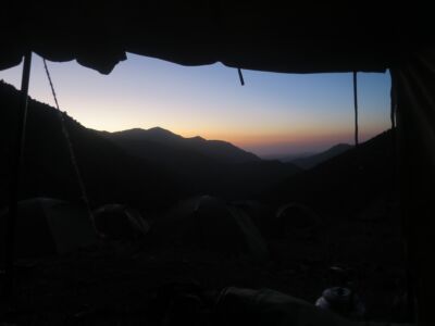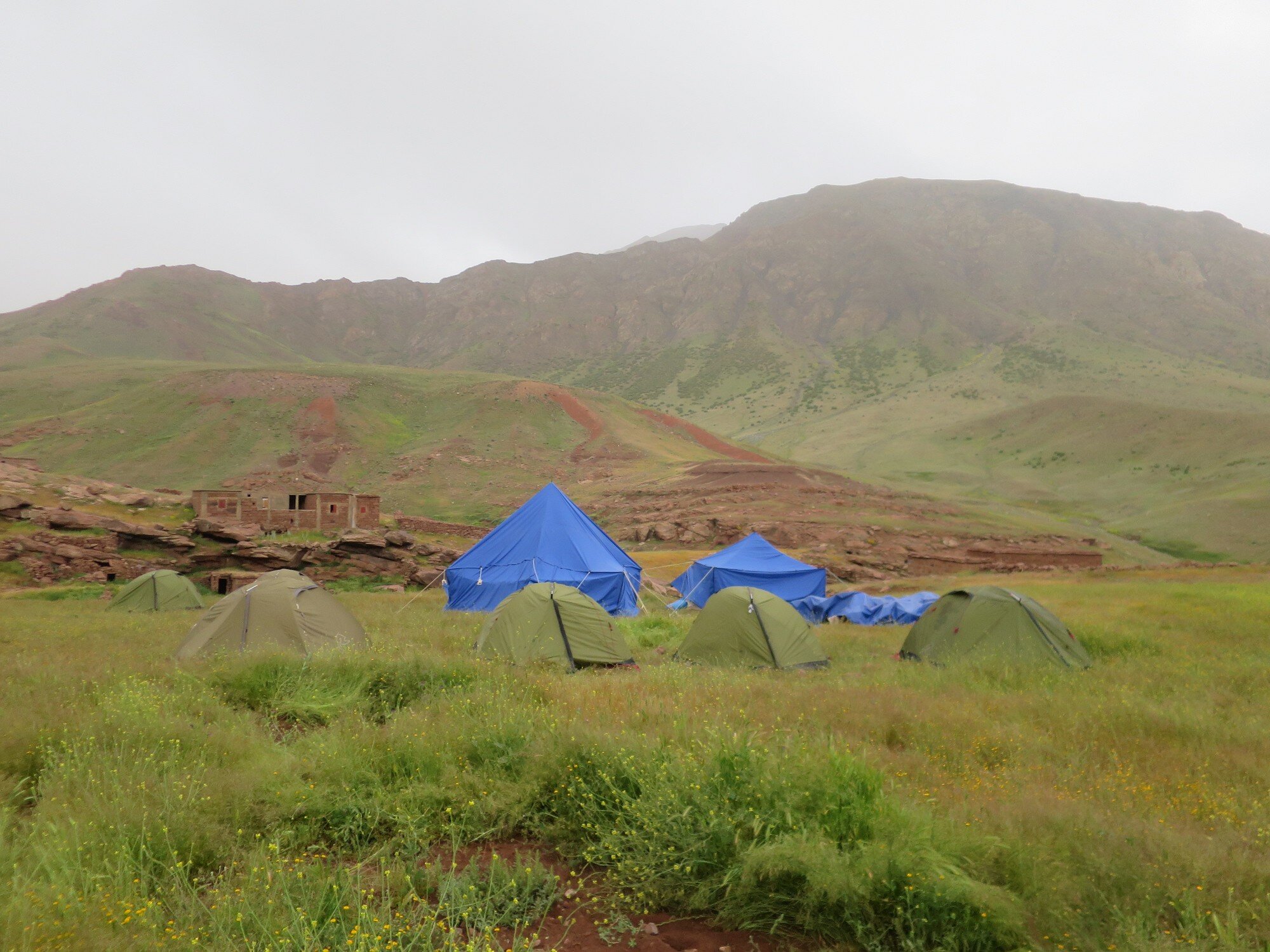 Wir verließen schließlich das Plateau und gingen ein Stück abwärts zu unserem in der Nähe eines kleinen Flusses gelegenen Lagerplatz. Alle Zelte waren bereits von der sehr emsigen Crew aufgebaut – Jetzt folgte der obligatorische Pfefferminztee und gegen später ein reichhaltiges Abendessen. Wir genossen die wunderbare Abendstimmung auf dieser grünen Wiese (mit Orchideen und wilden Gladiolen). Aufgrund des Schlechtwettereinbruchs waren die höheren Bergspitzen sogar etwas mit Neuschnee gepudert. An einem Brunnen bzw. Flusslauf konnten wir uns erfrischen und ausgiebig waschen. Danach ging es auch bald in unsere Schlafsäcke…