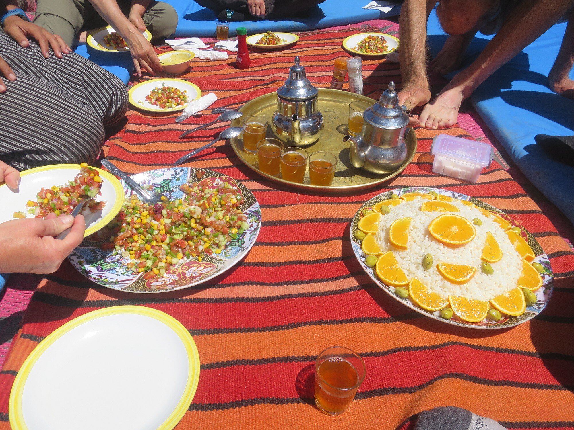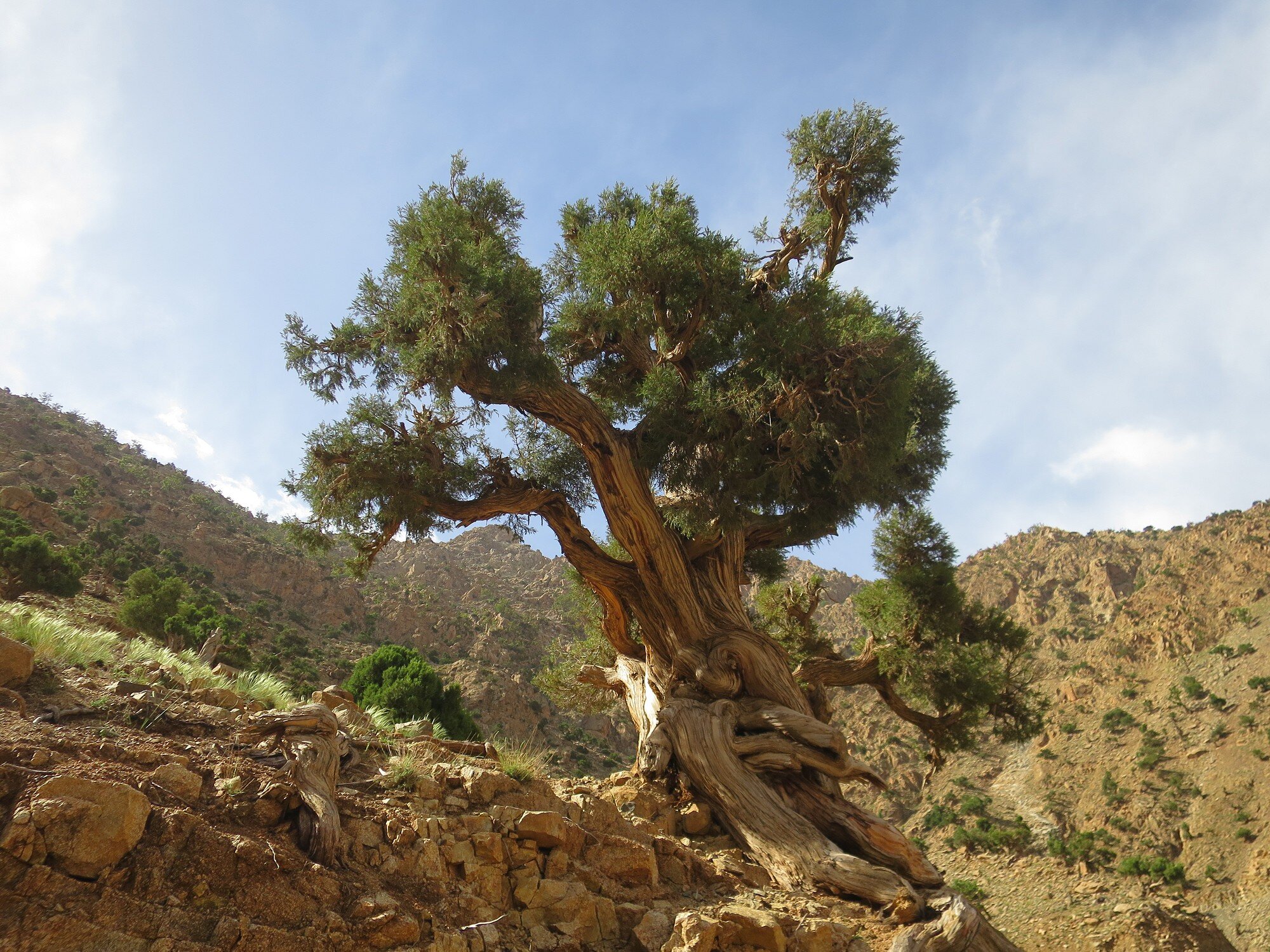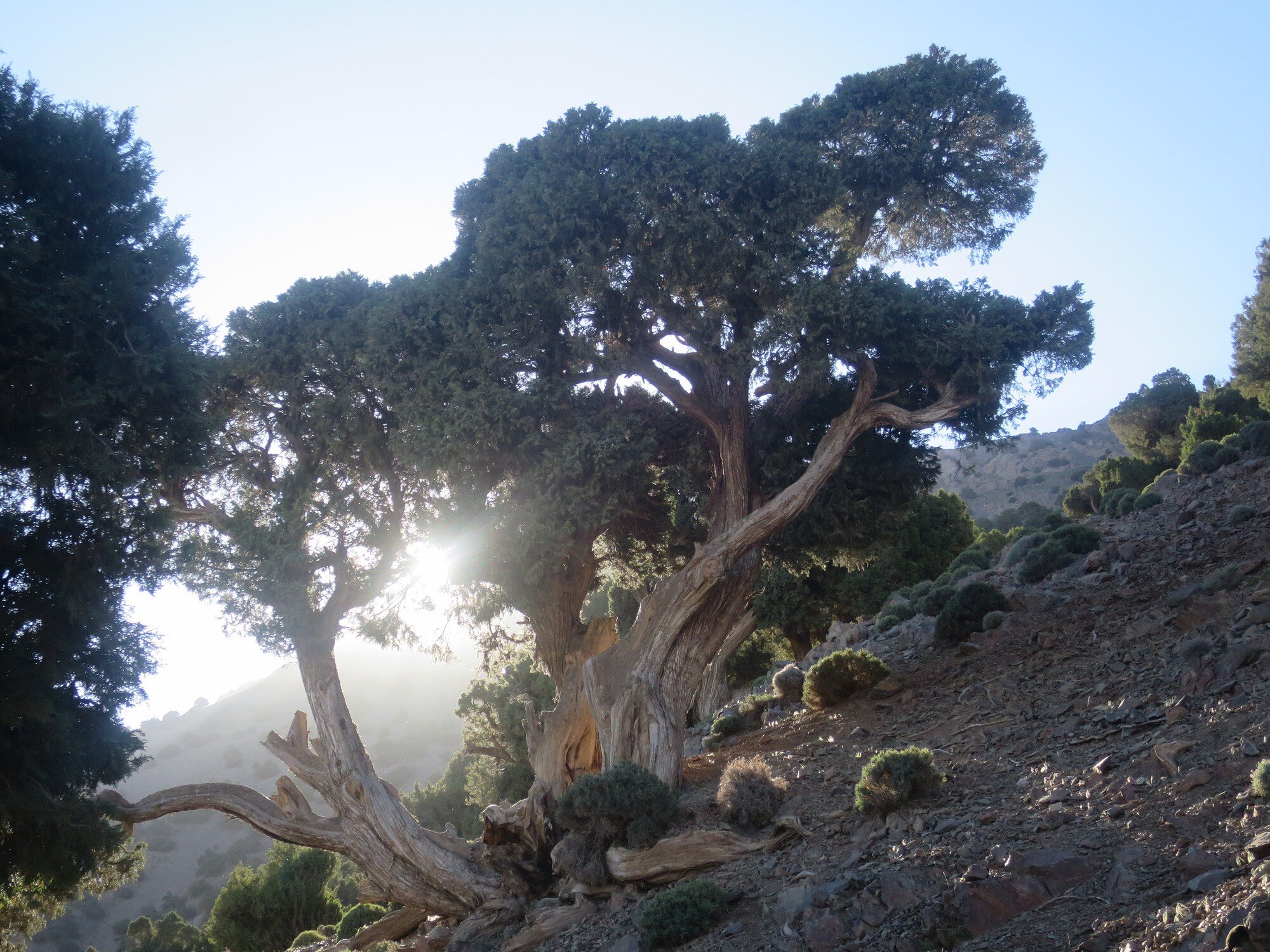Nach einer relativ geruhsamen Nacht in unseren Zelten und einem gemeinsamen Frühstück starteten wir zu unserer 1. Trekkingetappe im Hohen Atlas: Zuerst ging es durch einen Wacholderwald den Berg hinauf. Etwas später leuchtete die Erde ringsum rot aufgrund der Eiseneinlagerungen im Gestein. Der Aufstieg war etwas schweißtreibend, doch die großartige Landschaft um uns herum entschädigte für diese Strapazen. „Pünktlich“ gegen 10:00 Uhr gab es unter einem schattenspendenden Baum eine Nüsschen-Pause mit landestypischen Knabbereien. Diese Zwischenmahlzeit gab es auch die nächsten Tage!