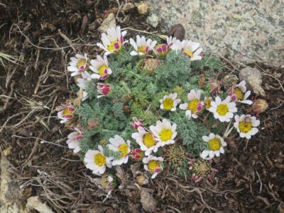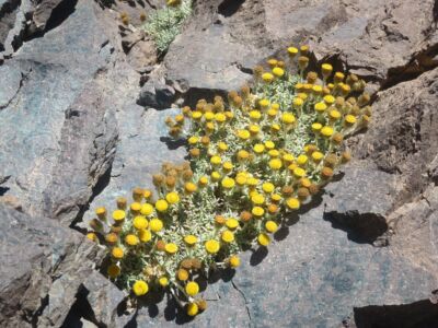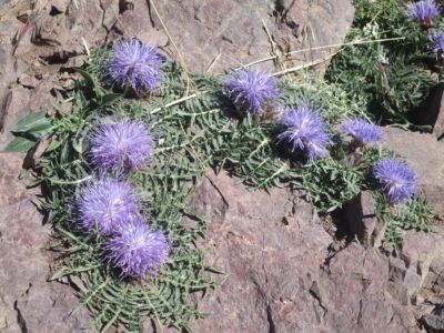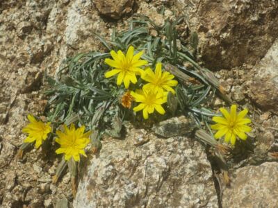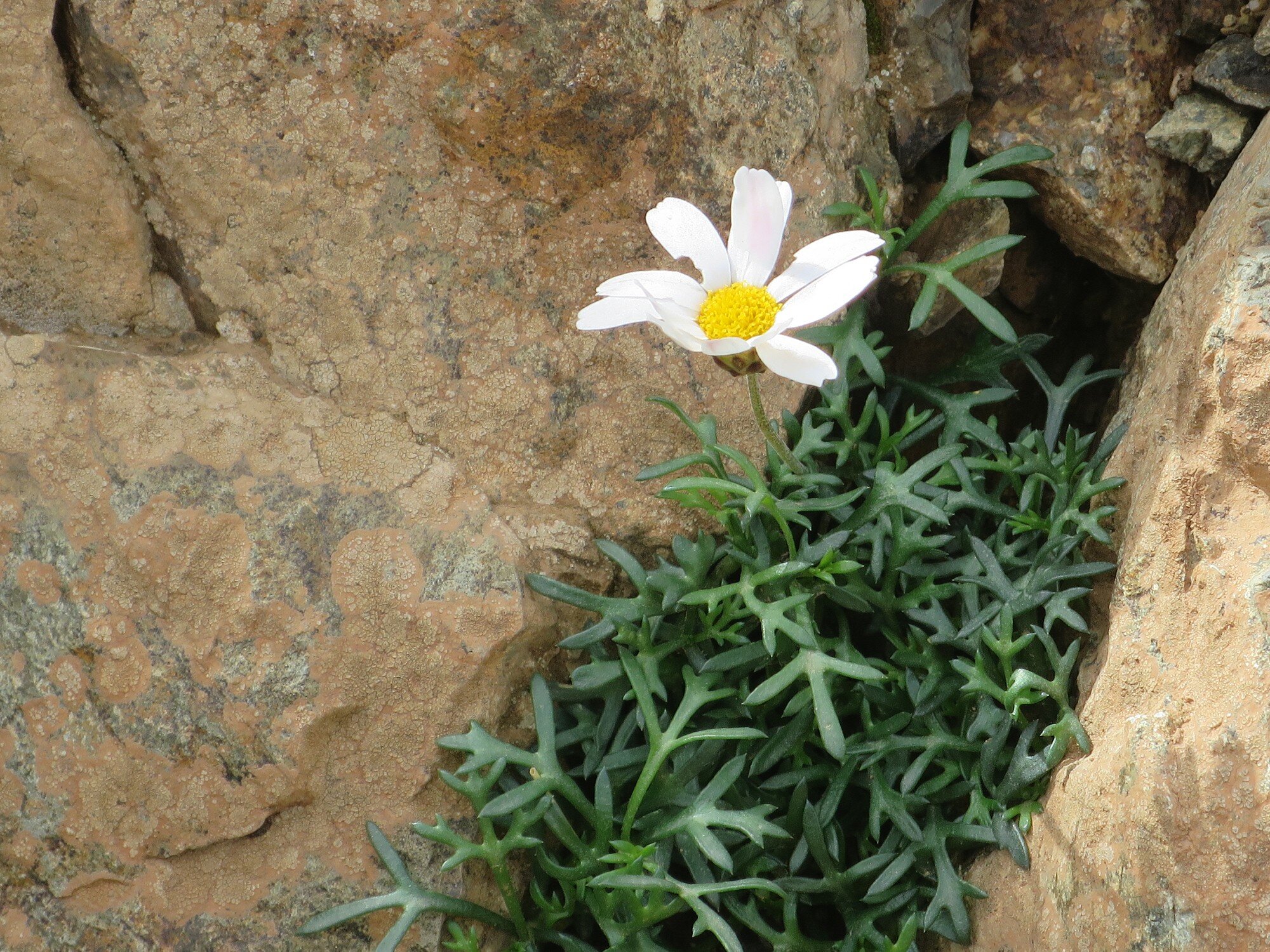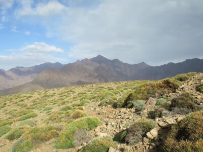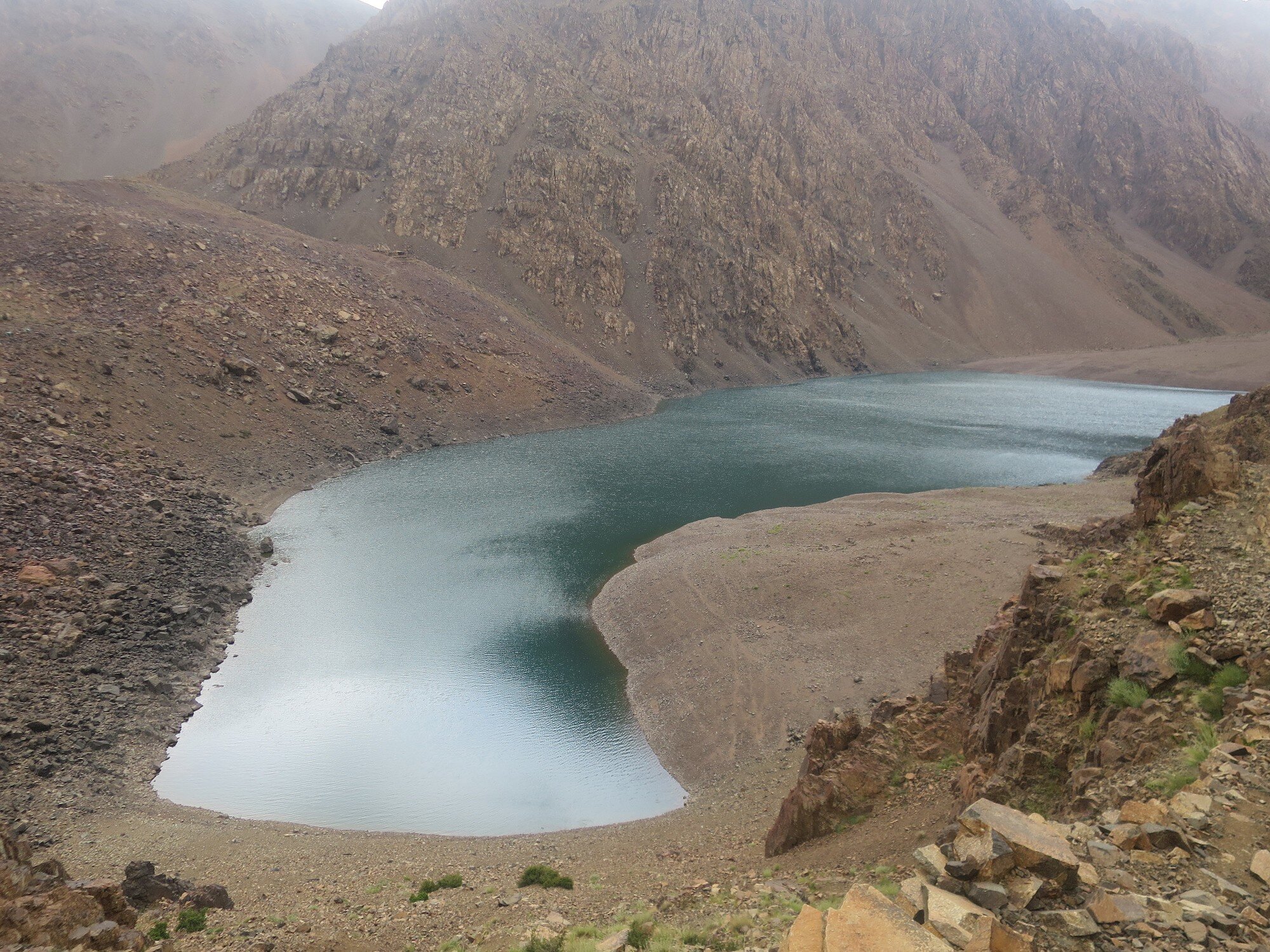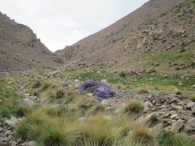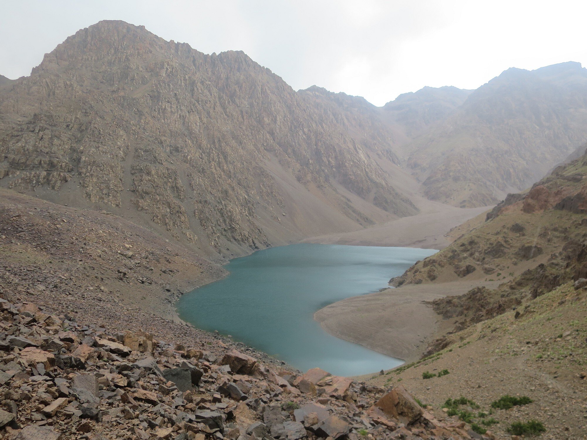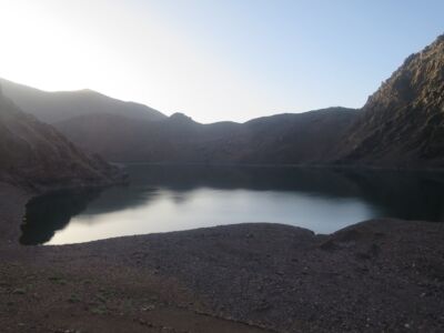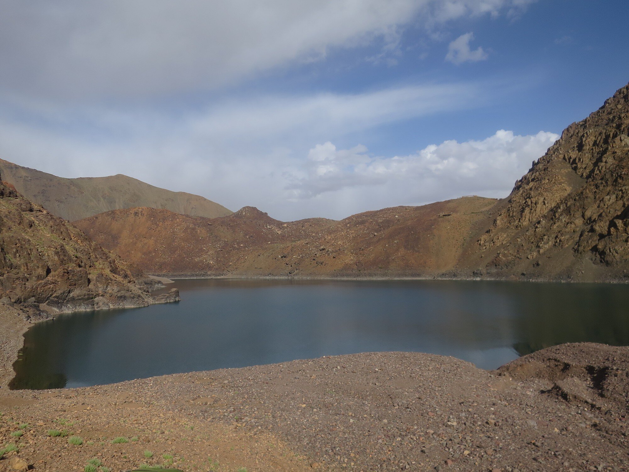 Nach einer relativ erholsamen Nacht und unserem Frühstück wanderten wir zunächst ein kleines Stück bergauf zum Aourai-Pass (3.100 m). Danach ging es über karge, kuppelförmige Berge immer leicht auf und ab. Auf dem steinigen Boden entdeckten wir die verschiedensten Atlaspölster, deren kleine Blüten uns in den unterschiedlichsten Farben entgegenleuchteten. Beim Wandern genossen wir die Aussicht über die wüstenartige Berglandschaft hinunter in die Täler, in denen oft kleine Bäche fließen und die grünen Bänder der Terrassenfelder die trockene Landschaft durchbrechen. Schließlich erreichten wir das kleine Dorf Amsouzart (1.740 m) – Hier bemerkten wir zum ersten Mal einen bescheidenen Massentourismus: Ein modernes Café war Treffpunkt für Trekkingtouristen aus aller Welt. Danach fuhren wir mit einem Privat-Transfer bis in eines der nächsten Dörfer, wo unsere Mittagspause stattfand. Nachdem wir uns ausgiebig gestärkt hatten, folgten wir zuerst der Fahrstraße, danach einem Wanderweg bis zu einem Pass auf 2.400 m, der sich schon in der Zone des Toubkal Nationalparks befindet. Von hier bot sich ein herrlicher Ausblick auf den smaragdgrünen Lac d’Ifni, der von einer beeindruckenden Gebirgskulisse umgeben ist. Direkt am Ufer des Sees war bereits das Camp für die Nacht errichtet. Der Rest des Tages diente zur Erholung und Entspannung in dieser wunderschönen Umgebung. Ein paar Teilnehmer wagten sogar den Sprung ins kühle Nass.