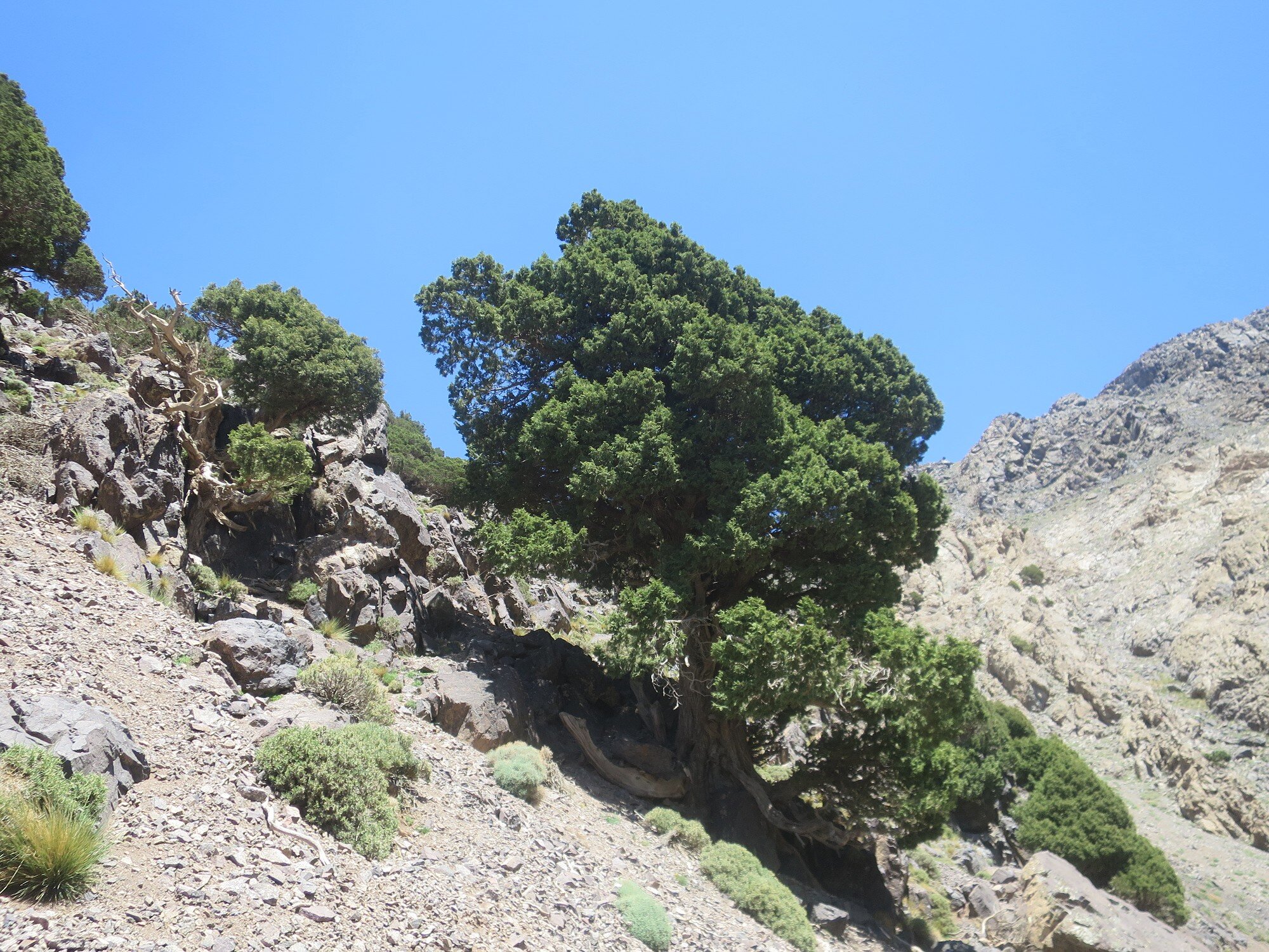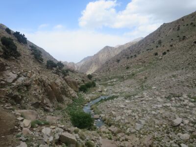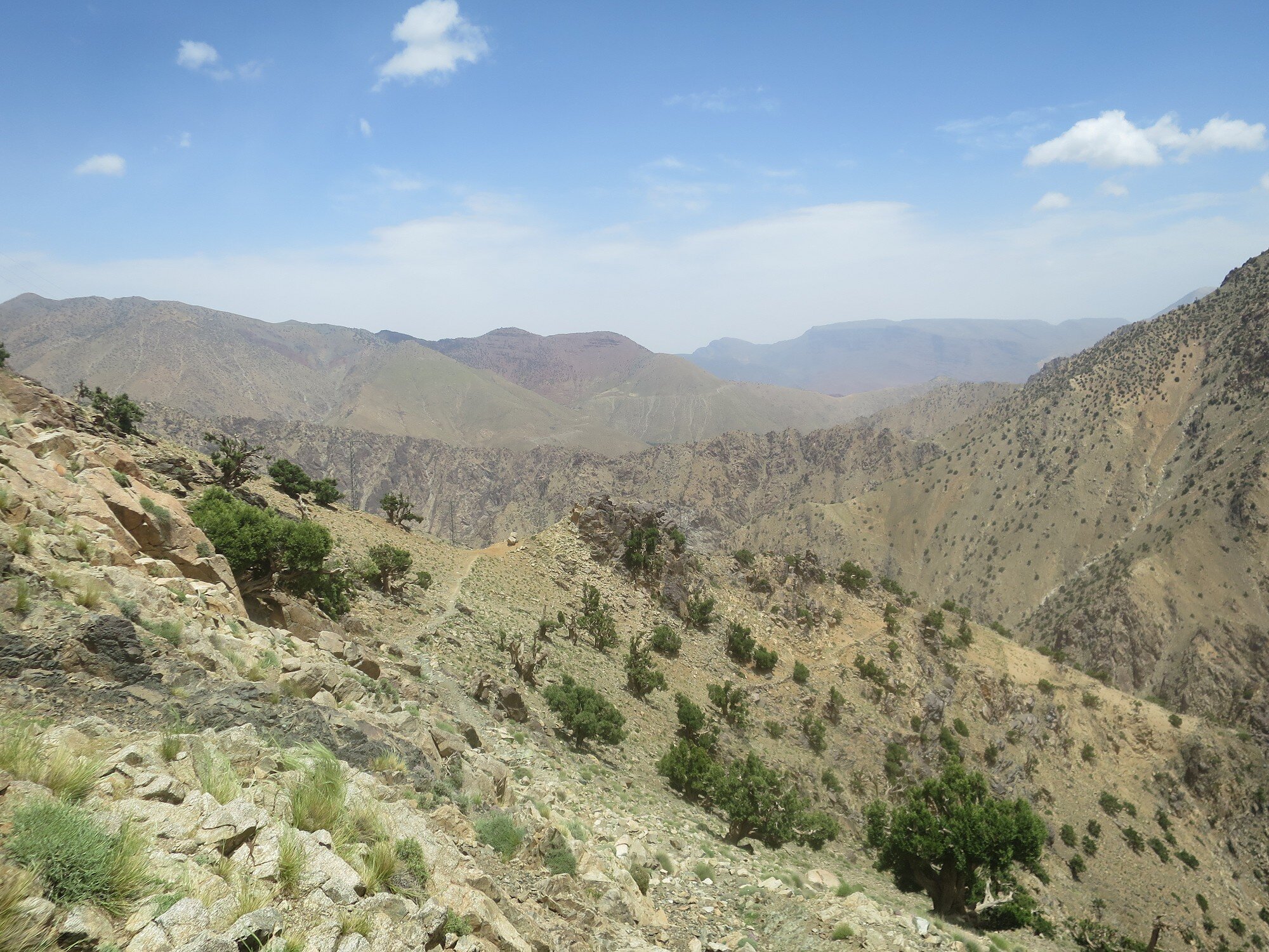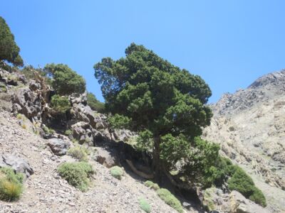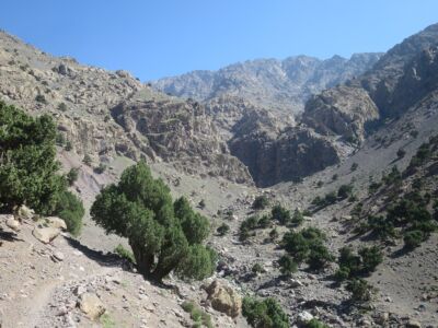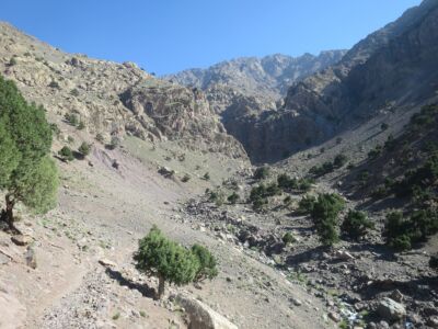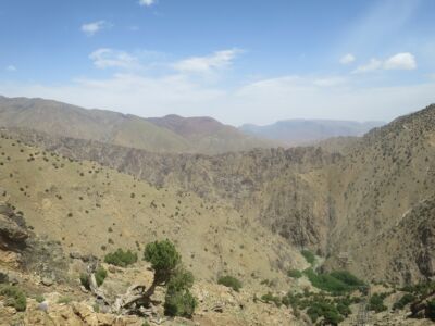 Früh am Morgen verließen wir das Ourika-Tal und gingen entlang vom Assaka-Fluss. Da der Weg mehrmals den Flusslauf kreuzte, waren hier Trekkingsandalen unbedingt erforderlich. Aufgrund der Regenfälle der letzten Tage führte der Flusslauf relativ viel Wasser – Also ein wenig Akrobatik war da gefragt 😊An den Felswänden entdeckten wir mehrere Berberaffen. Nach zirka einer Stunde stiegen wir wieder in unsere Bergschuhe und verließen das Tal, eine unbefestigte Piste leitete uns bis oberhalb vom Dorf Tamatert. Dieses Bergdorf klebt regelrecht an einem steilen Berghang. Auf den Terrassen wird Mais, Getreide und Gemüse angebaut. Nach dem Dorf begann der Aufstieg zum Tizi n’Tamatert (Tizi = Pass) mit Aussicht auf das vor uns liegende Assaka-Tal. Wir stiegen ins Tal mit seinen Schatten spendenden Walnussbäumen hinab. Auch hier machten sich die Regenfälle der letzten Zeit bemerkbar – Ein Teil des Walnusshaines stand unter Wasser. Auf der gegenüberliegenden Seite begann dann ein längerer Anstieg (ca. 400 Höhenmeter), vorbei an knorrigen Exemplaren der endemischen Atlas-Zypresse (https://de.wikipedia.org/wiki/Atlas-Zypresse). Schließlich erreichten wir den nächsten Pass, den Tizi n’Amanzal. Unser Mittagessen nehmen wir im Dorf Amanzal ein. Dieses Bergdorf wurde leider teilweise durch das schwere Erdbeben im Herbst 2023 beschädigt. Lediglich ein älterer Mann hält sich dort noch zeitweise auf und bestellt noch seine Felder. Wir kamen in den Genuss seiner Gastfreundschaft – Auf uns wartete wieder ein leckeres Mittagessen. Nach der wohlverdienten Pause ging es in einem stark zerklüfteten Tal bergan, bis wir unseren Lagerplatz für die heutige Nacht erreichen.