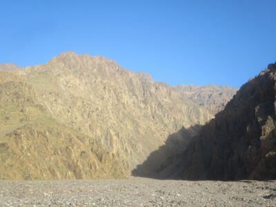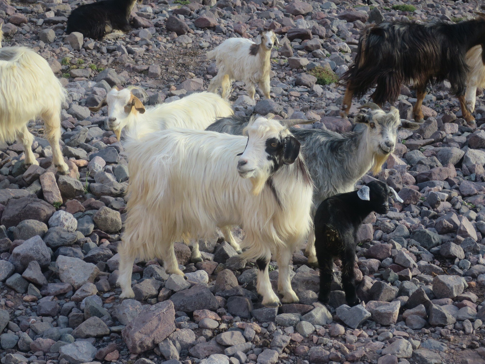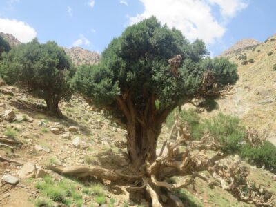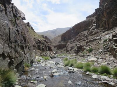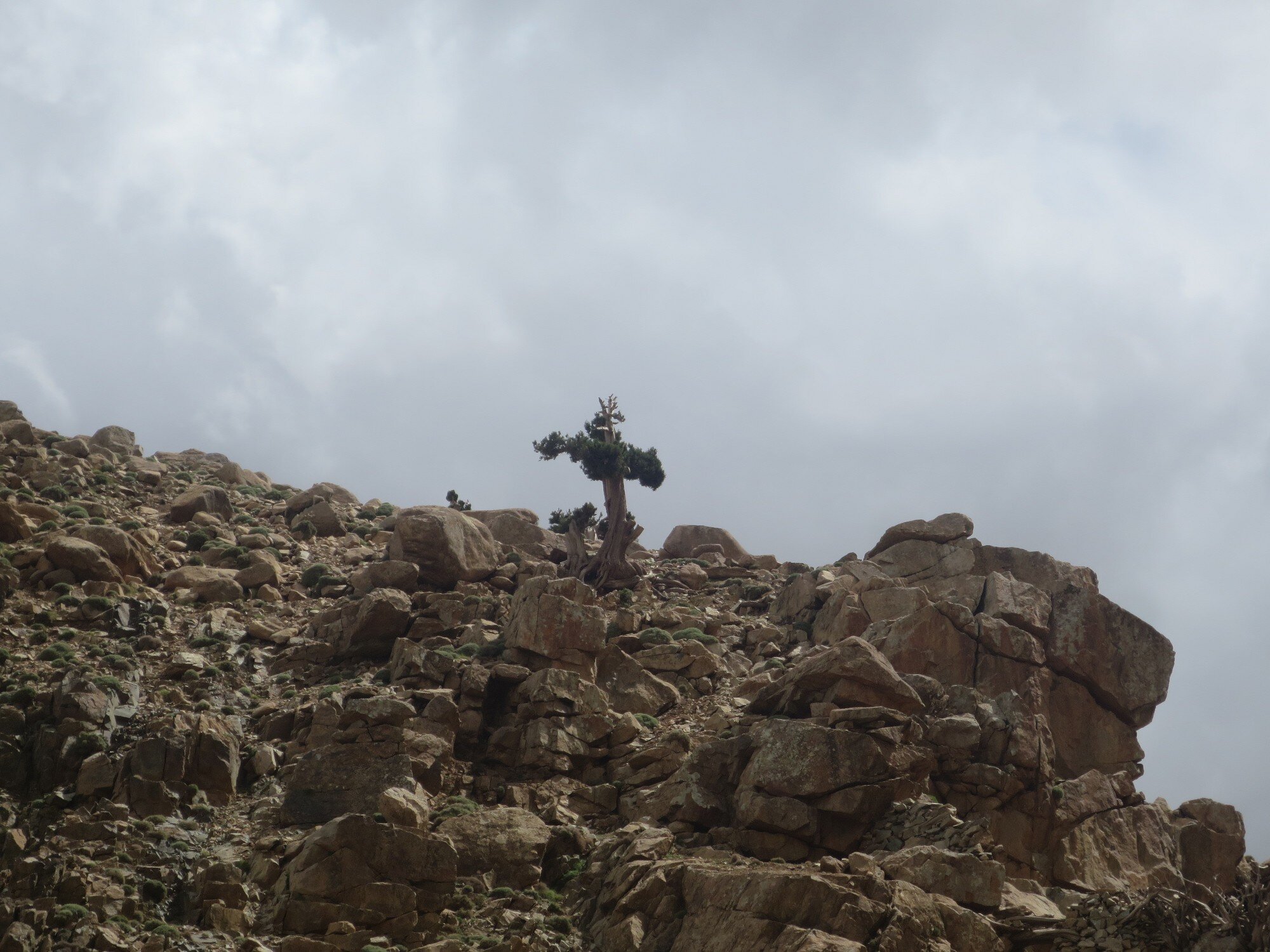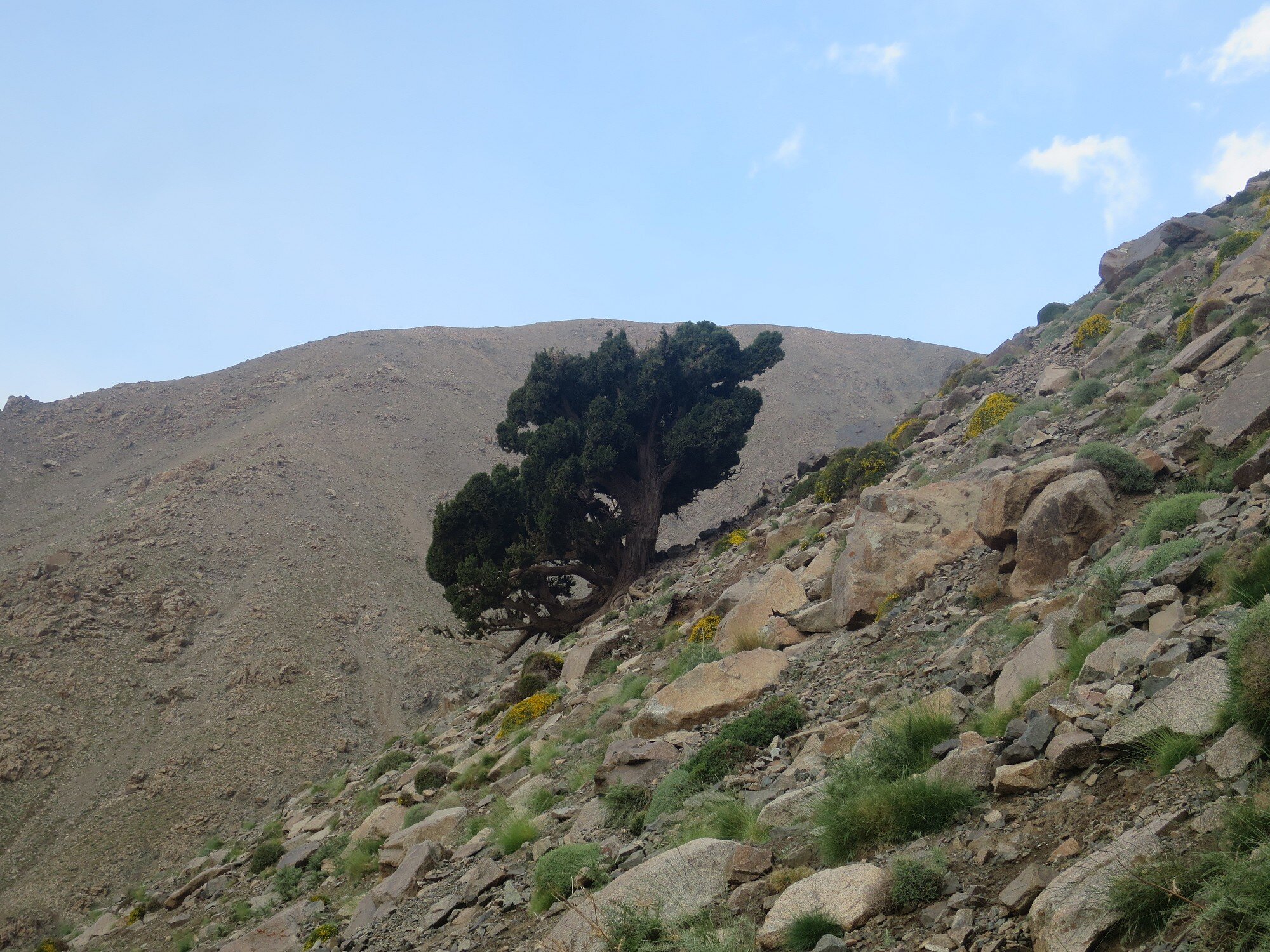 Früh am Morgen verließen wir das Ourika-Tal und gingen entlang vom Assaka-Fluss. Da der Weg mehrmals den Flusslauf kreuzte, waren hier Trekkingsandalen unbedingt erforderlich. Aufgrund der Regenfälle der letzten Tage führte der Flusslauf relativ viel Wasser – Also ein wenig Akrobatik war da gefragt 😊An den Felswänden entdeckten wir mehrere Berberaffen. Nach zirka einer Stunde stiegen wir wieder in unsere Bergschuhe und verließen das Tal, eine unbefestigte Piste leitete uns bis oberhalb vom Dorf Tamatert. Dieses Bergdorf klebt regelrecht an einem steilen Berghang. Auf den Terrassen wird Mais, Getreide und Gemüse angebaut. Nach dem Dorf begann der Aufstieg zum Tizi n’Tamatert (Tizi = Pass) mit Aussicht auf das vor uns liegende Assaka-Tal. Wir stiegen ins Tal mit seinen Schatten spendenden Walnussbäumen hinab. Auch hier machten sich die Regenfälle der letzten Zeit bemerkbar – Ein Teil des Walnusshaines stand unter Wasser. Auf der gegenüberliegenden Seite begann dann ein längerer Anstieg (ca. 400 Höhenmeter), vorbei an knorrigen Exemplaren der endemischen Atlas-Zypresse (https://de.wikipedia.org/wiki/Atlas-Zypresse). Schließlich erreichten wir den nächsten Pass, den Tizi n’Amanzal. Unser Mittagessen nehmen wir im Dorf Amanzal ein. Dieses Bergdorf wurde leider teilweise durch das schwere Erdbeben im Herbst 2023 beschädigt. Lediglich ein älterer Mann hält sich dort noch zeitweise auf und bestellt noch seine Felder. Wir kamen in den Genuss seiner Gastfreundschaft – Auf uns wartete wieder ein leckeres Mittagessen. Nach der wohlverdienten Pause ging es in einem stark zerklüfteten Tal bergan, bis wir unseren Lagerplatz für die heutige Nacht erreichen.