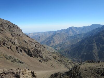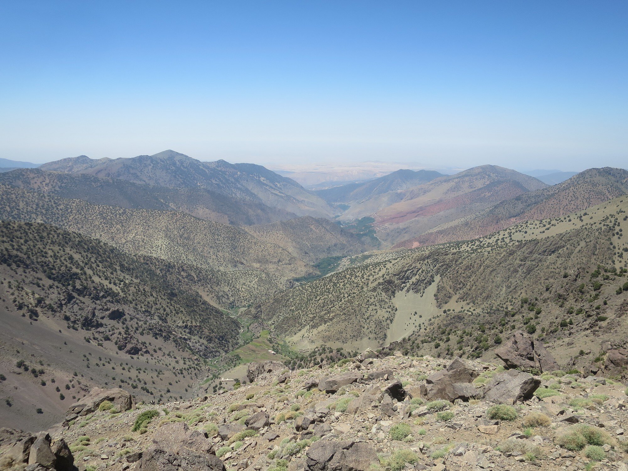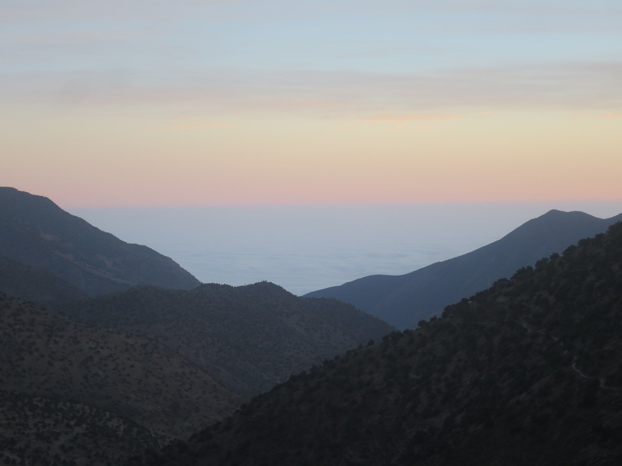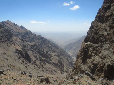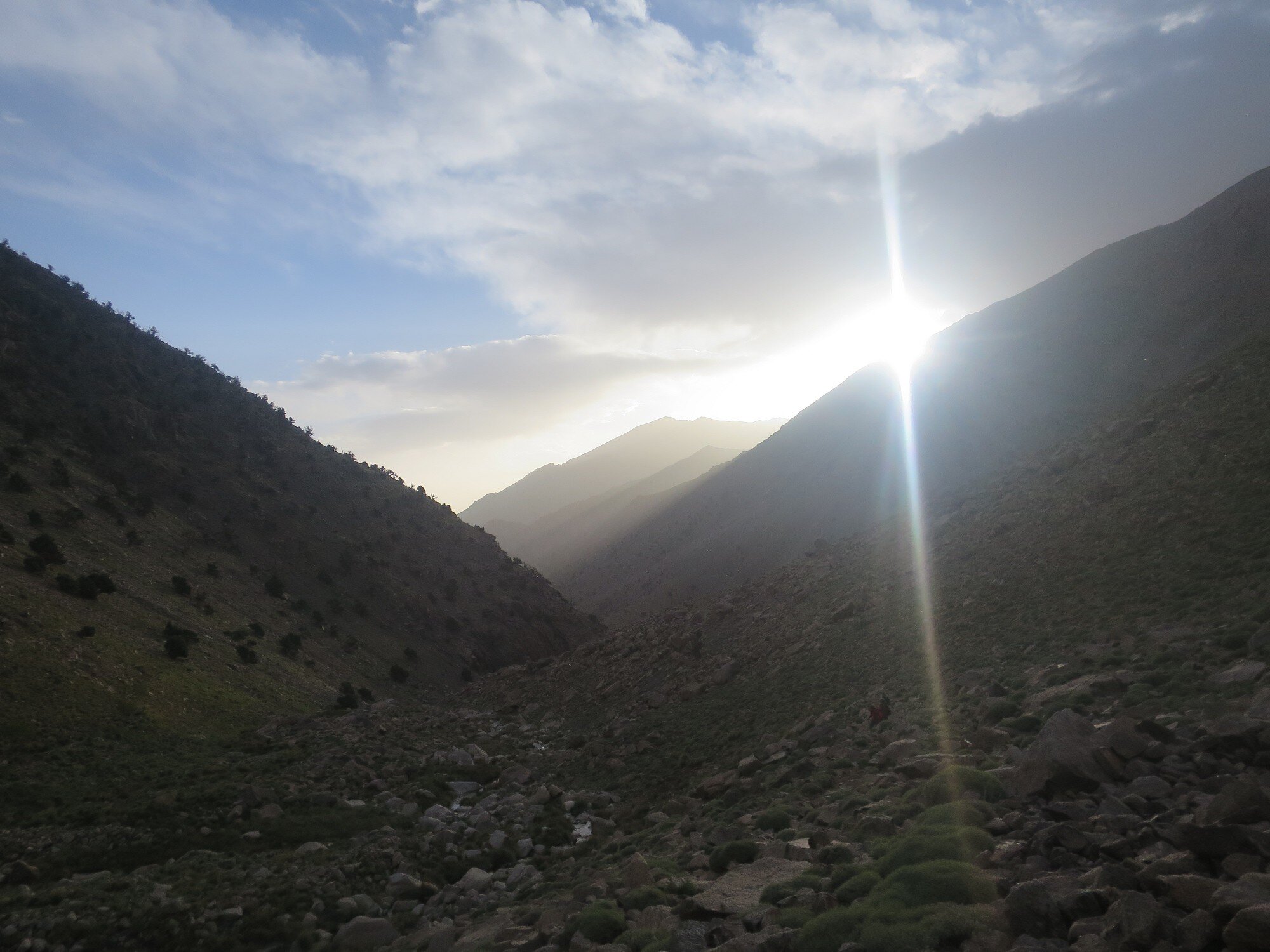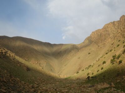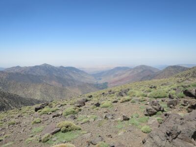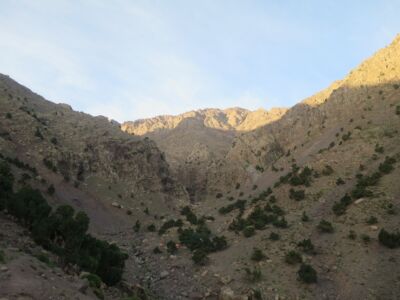 Nach dem Frühstück mussten wir Abschied vom Toubkal Basecamp nehmen – Wir brachen auf zum Tizi n’Aguelzim (3.450 m). Vom Pass hatten wir einen herrlichen Ausblick auf den Toubkal, das Kik-Plateau und hinunter bis Sidi Chamharouch, einer kleinen Wallfahrtsstätte der einheimischen Bevölkerung. Danach ging es in eindrucksvollen Serpentinen bergab. In dieser kargen Landschaft fanden wir nun mehr vereinzelt Wacholdersträucher. Nach der Mittagspause auf fast 3000 Metern Höhe ging es in weitem Bogen entlang des Berghangs und weiter durch ein schmales Tal und vorbei am wunderschönen Tamsoult Wasserfall. Hier gönnten wir uns einen frischgepressten Orangensaft und genossen die angenehme Kühle rund um den Wasserfall. Danach war es nicht mehr weit bis zu unserem Nachtlager oberhalb der Azib Tamsoulte (2.250 m). Die Abendstimmung inklusive Blick über die Ebene von Marrakesch war unbeschreiblich schön.