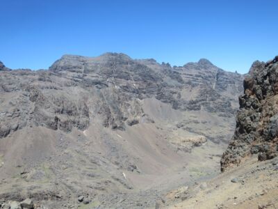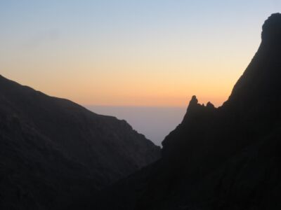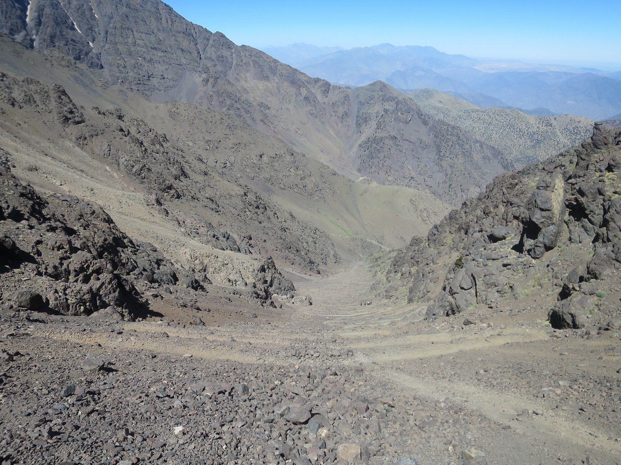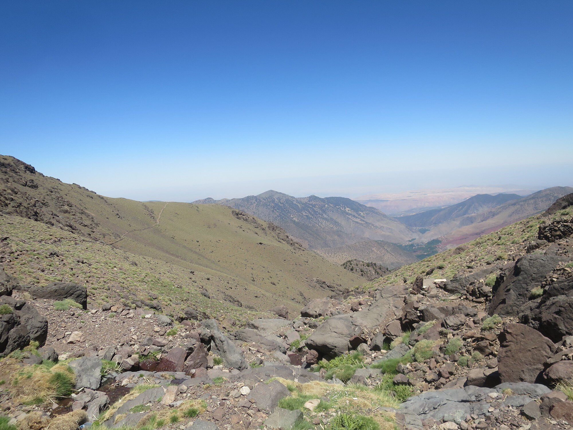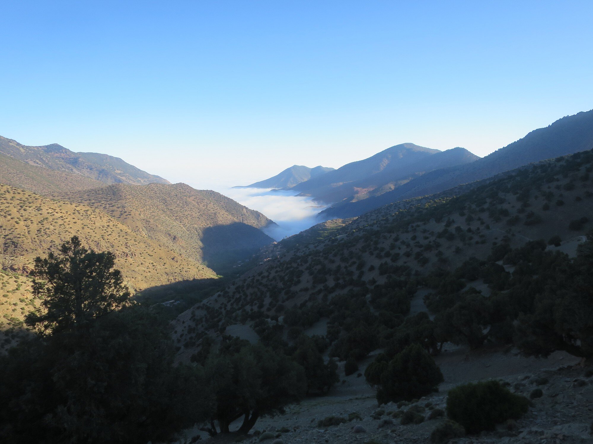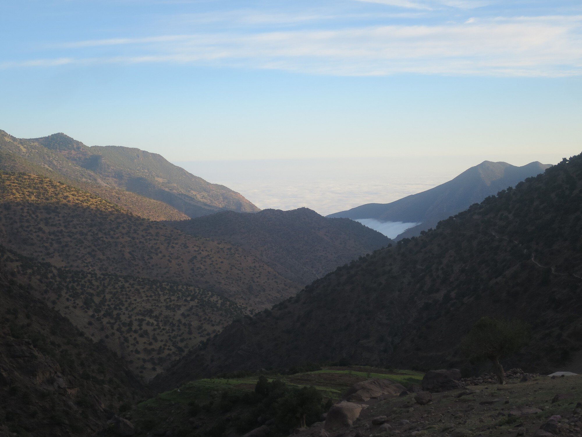 Nach dem Frühstück mussten wir Abschied vom Toubkal Basecamp nehmen – Wir brachen auf zum Tizi n’Aguelzim (3.450 m). Vom Pass hatten wir einen herrlichen Ausblick auf den Toubkal, das Kik-Plateau und hinunter bis Sidi Chamharouch, einer kleinen Wallfahrtsstätte der einheimischen Bevölkerung. Danach ging es in eindrucksvollen Serpentinen bergab. In dieser kargen Landschaft fanden wir nun mehr vereinzelt Wacholdersträucher. Nach der Mittagspause auf fast 3000 Metern Höhe ging es in weitem Bogen entlang des Berghangs und weiter durch ein schmales Tal und vorbei am wunderschönen Tamsoult Wasserfall. Hier gönnten wir uns einen frischgepressten Orangensaft und genossen die angenehme Kühle rund um den Wasserfall. Danach war es nicht mehr weit bis zu unserem Nachtlager oberhalb der Azib Tamsoulte (2.250 m). Die Abendstimmung inklusive Blick über die Ebene von Marrakesch war unbeschreiblich schön.