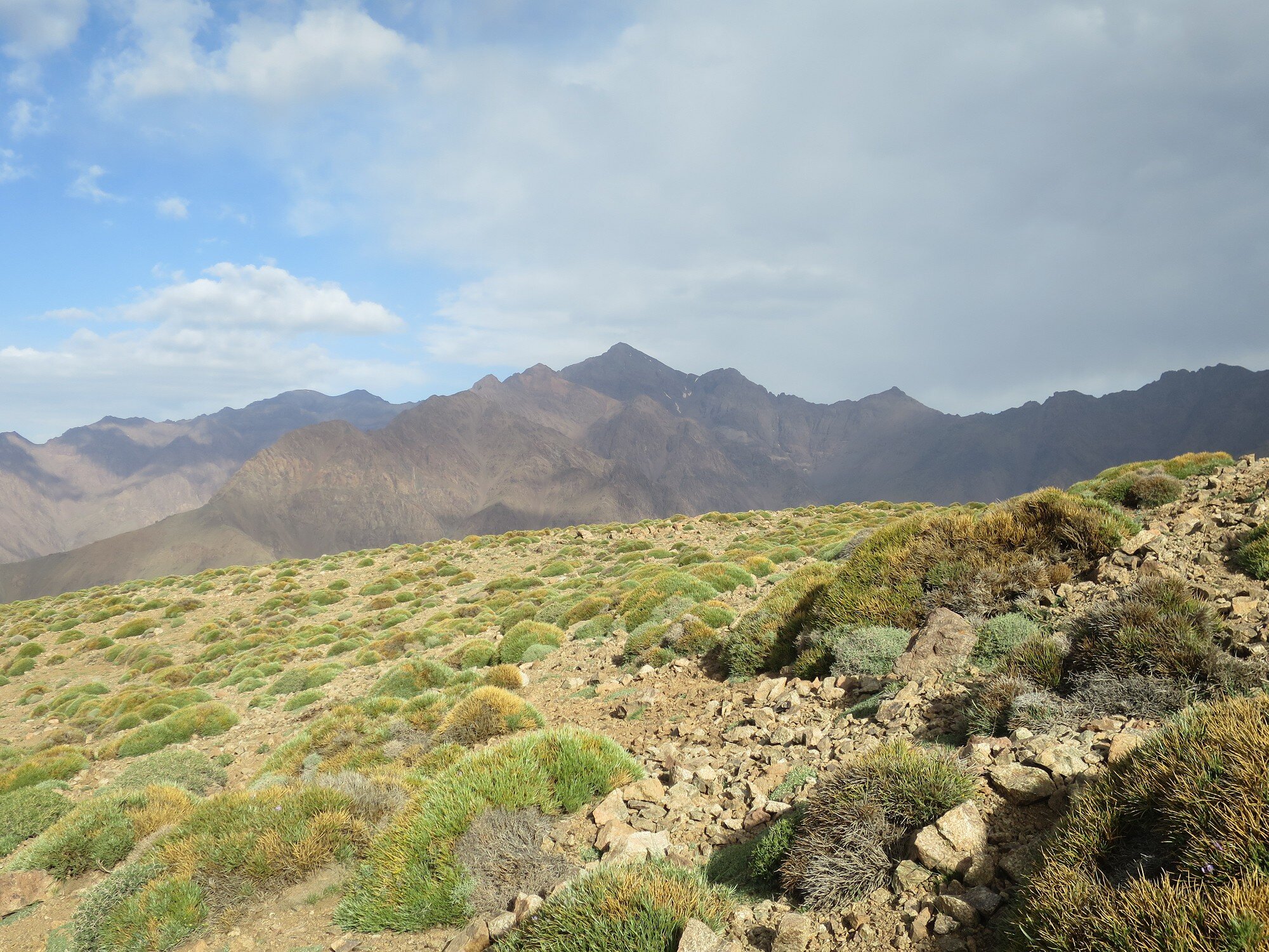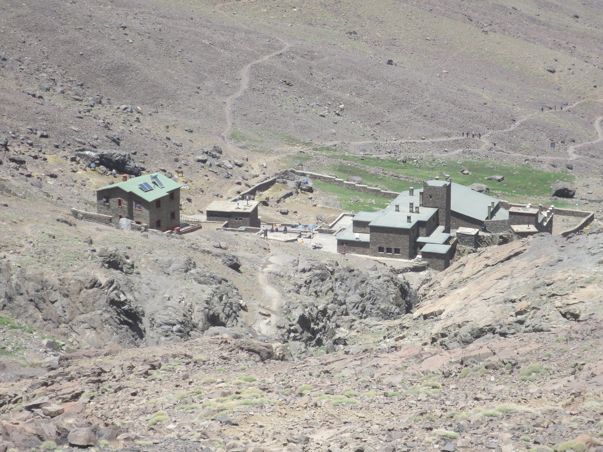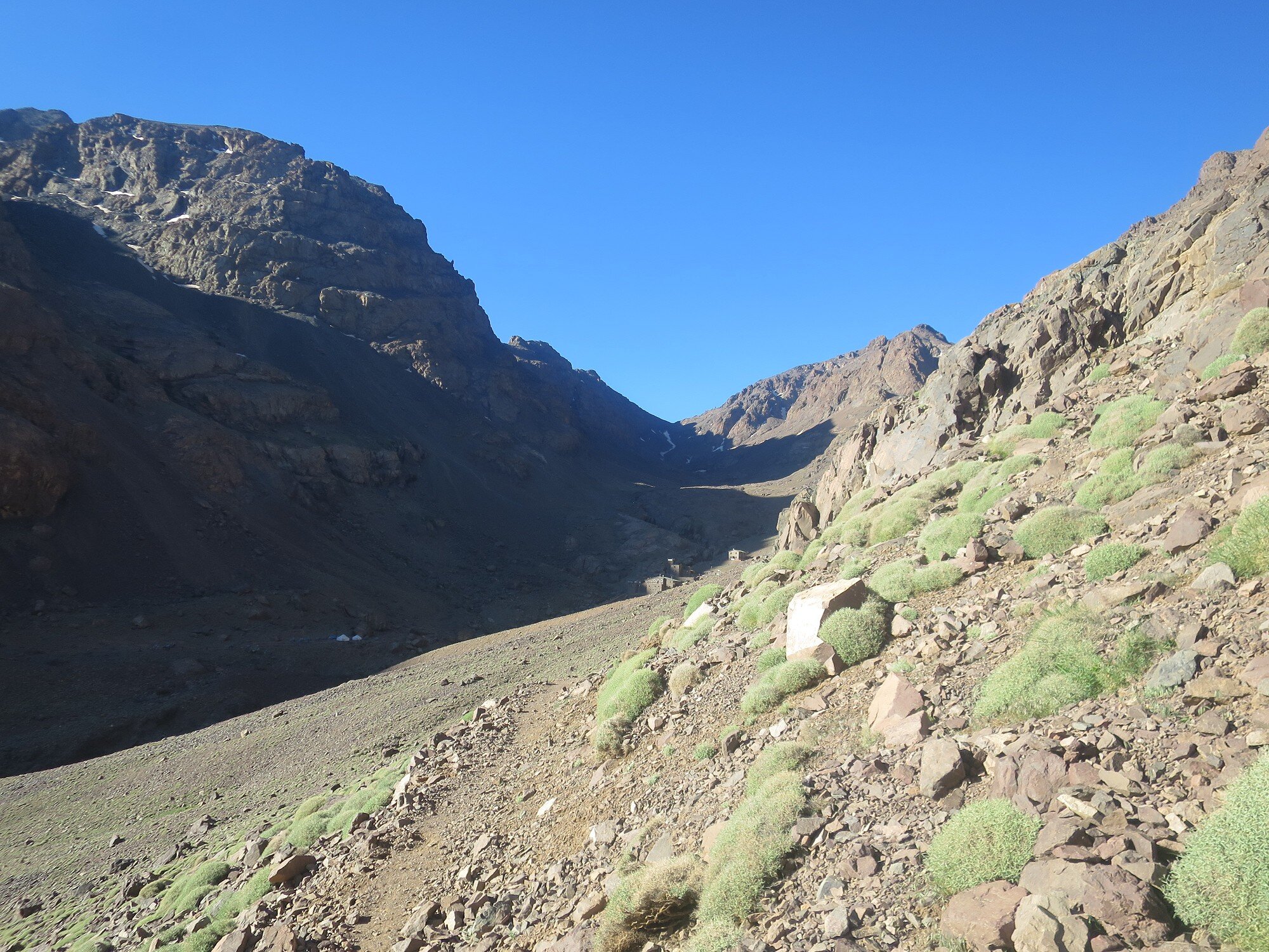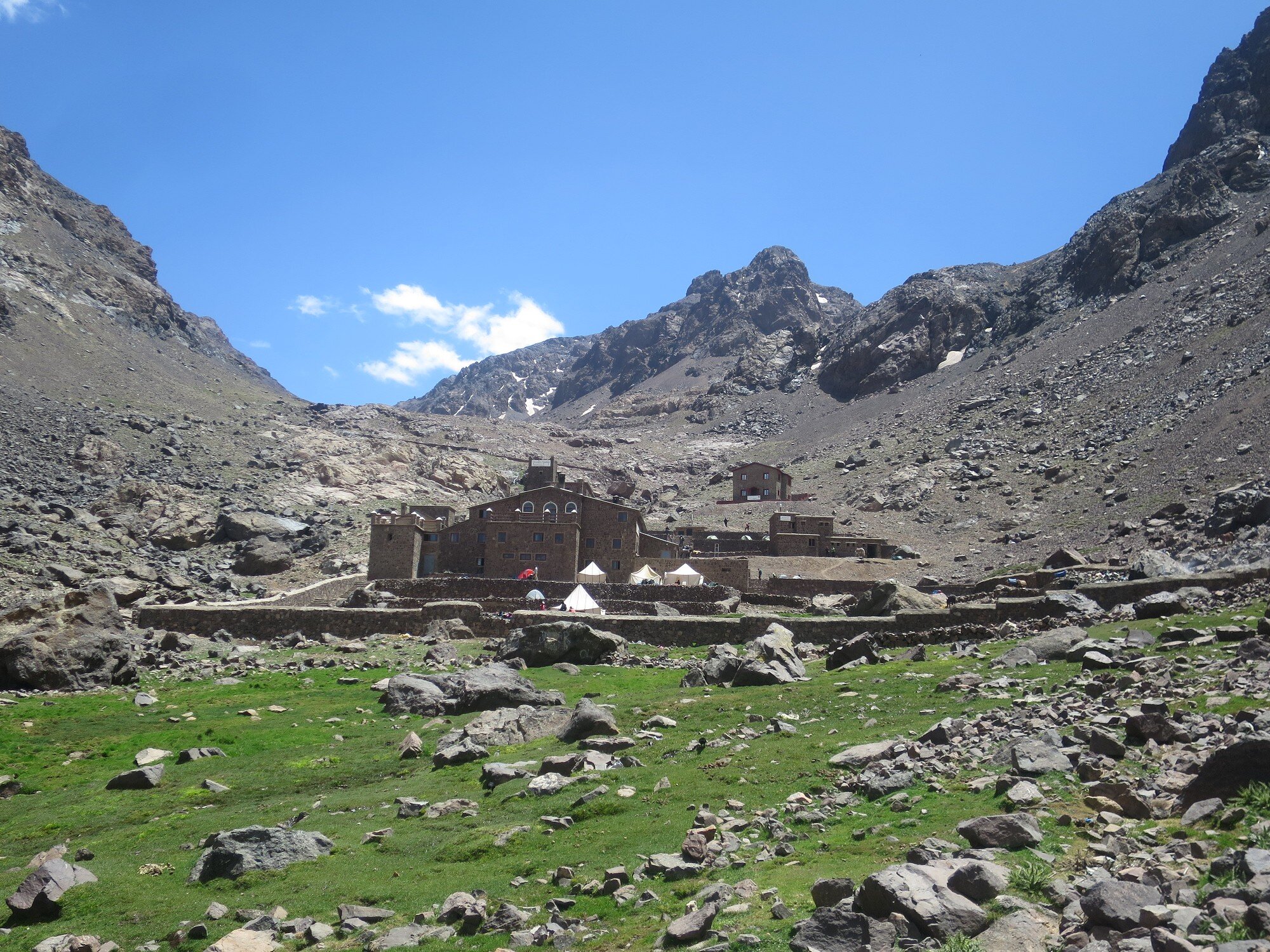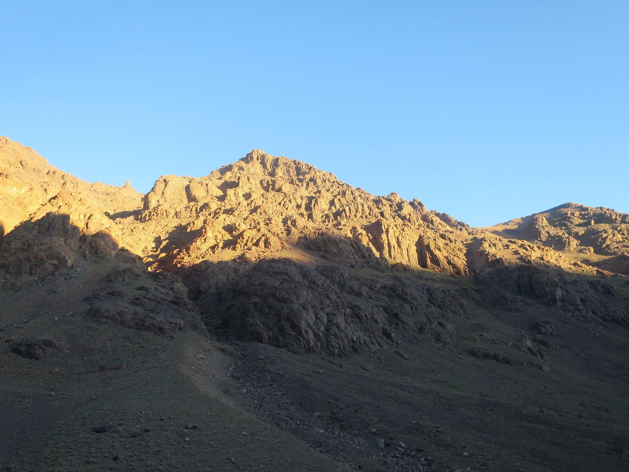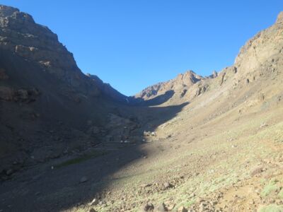 Sehr zeitig am frühen Morgen verließen wir diesen idyllischen Lagerplatz am See – die Morgenstimmung am See war unbeschreiblich schön – Doch uns erwartete ein langer Anstieg durch die Ouanoums-Schlucht bis zum 3.680 m hoch gelegenen Tizi n’Ouanoums. Der Weg dorthin war eindrucksvoll und führte stetig, teilweise in steilen Serpentinen, nach oben – Im oberen Teil des Aufstieges entdeckten wir einige (endemische) alpine Pflanzen. Vom Pass hatten wir einen wunderbaren Ausblick auf die zurückgelegte Strecke, den weit unter uns liegenden See und die umliegenden Viertausender des westlichen Hohen Atlas. In einer windgeschützten Nische am Pass gab es ein Mittagessen in Form eines Döners. Was für ein Komfort, ein Mittagessen liebevoll serviert in fast 3700 Metern Höhe! Über einen steilen Serpentinenpfad mit teilweise rutschigem Untergrund ging es hinunter zum Hochtal, in dem auch das Toubkal Base Camp (3.200 m) liegt. Ganz in der Nähe der beiden Berghütten befand sich unser Camp für die nächsten 2 Nächte. In den Hütten konnten wir uns bei einer heißen Dusche entspannen – Was für eine Wohltat nach der Katzenwäsche der letzten Tage. Von unserem Trekkingkoch Achmed und seiner Crew wurden wir mit einem feinen Abendessen (Spaghetti) verwöhnt. Diesmal legten wir uns sehr früh schlafen, denn am nächsten Morgen stand die Gipfeltour auf dem Programm.