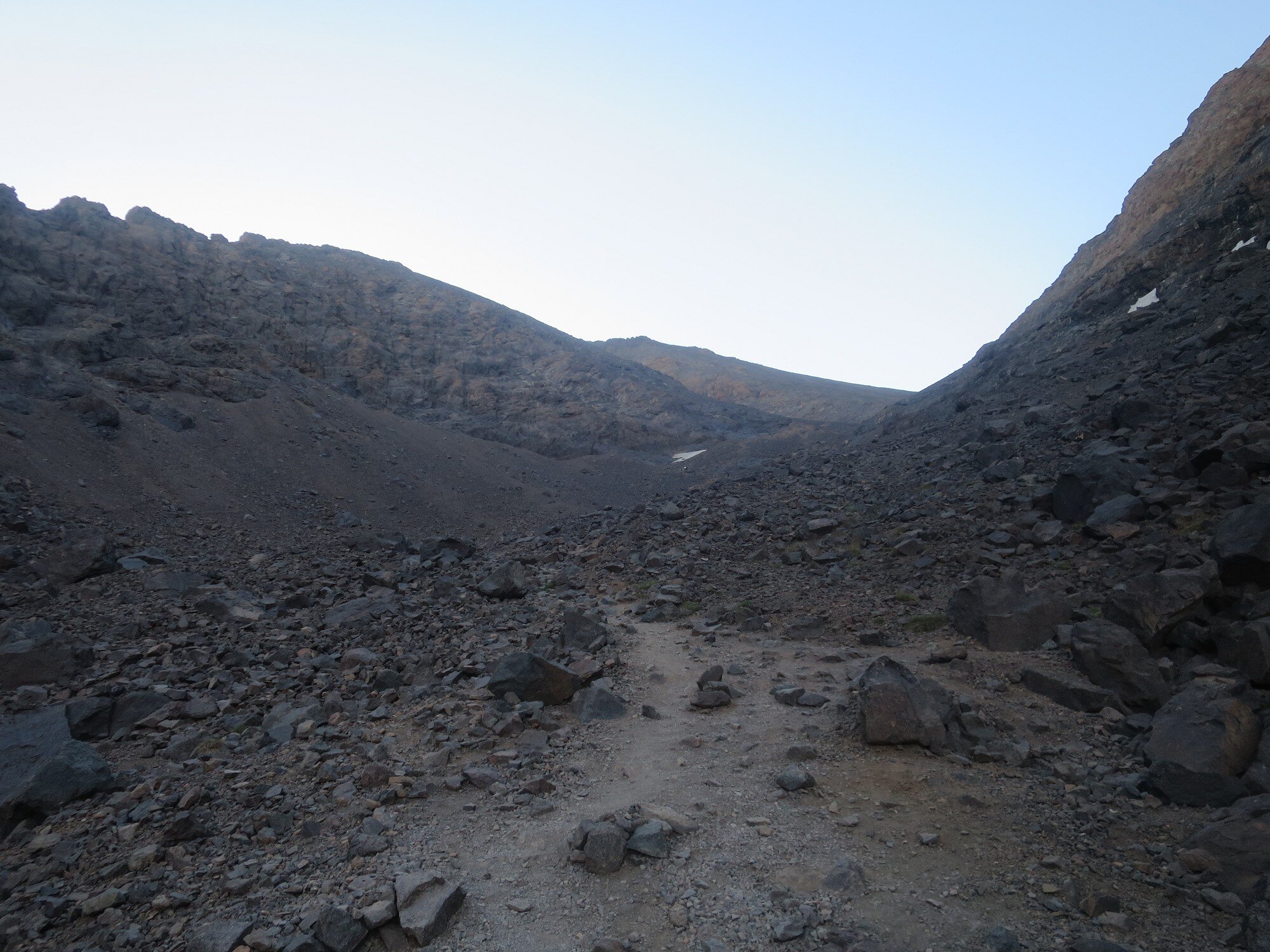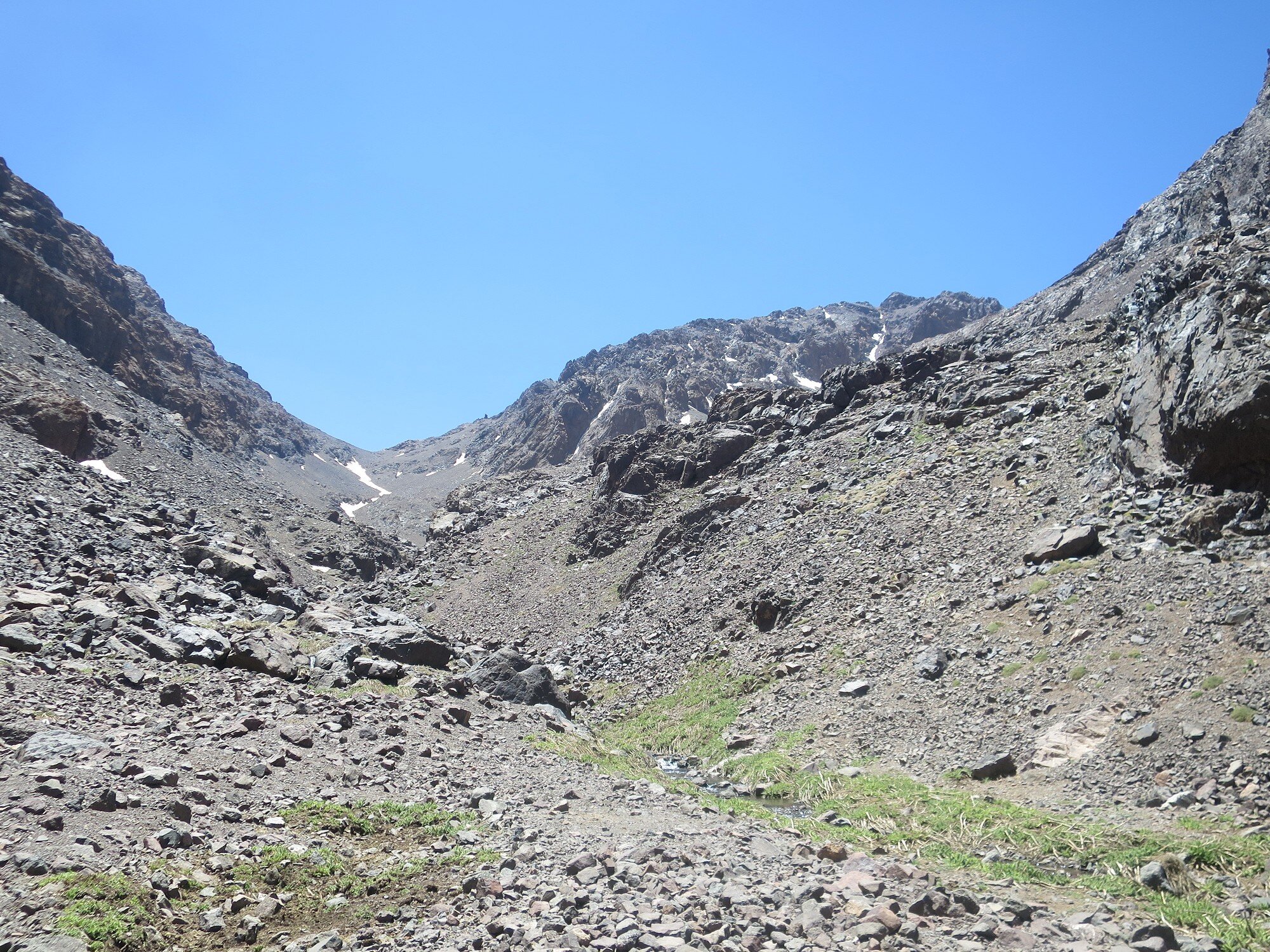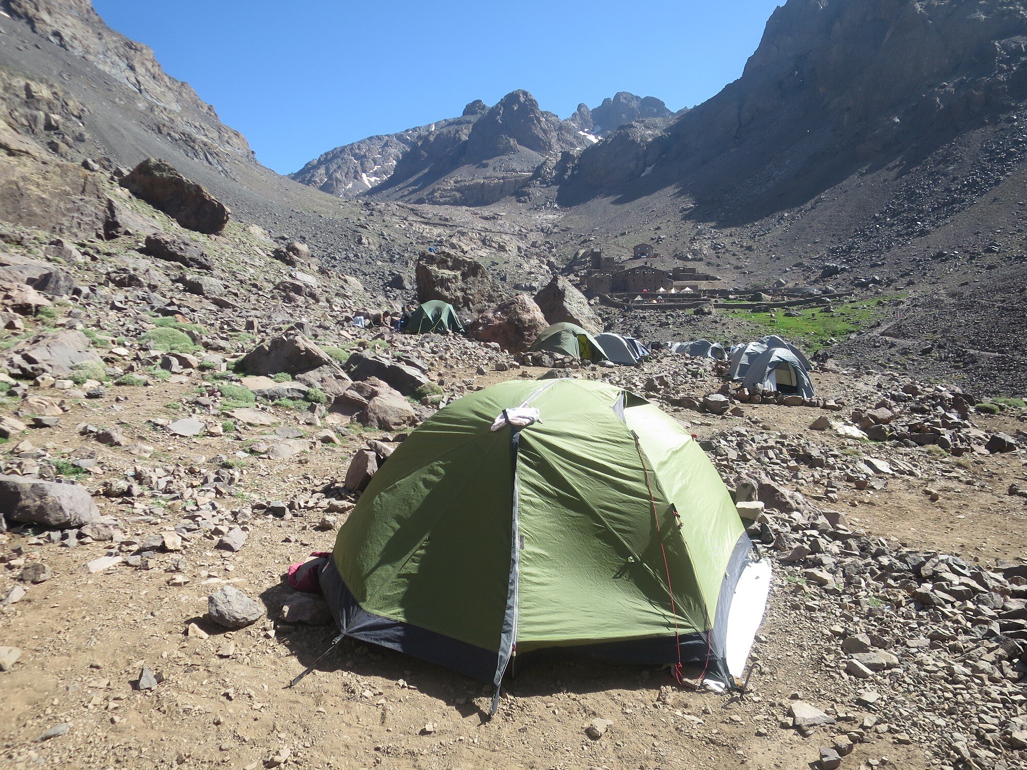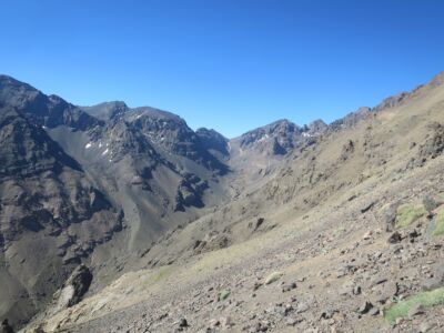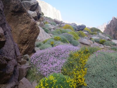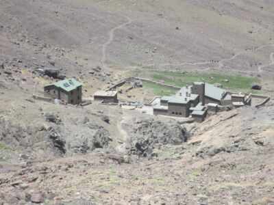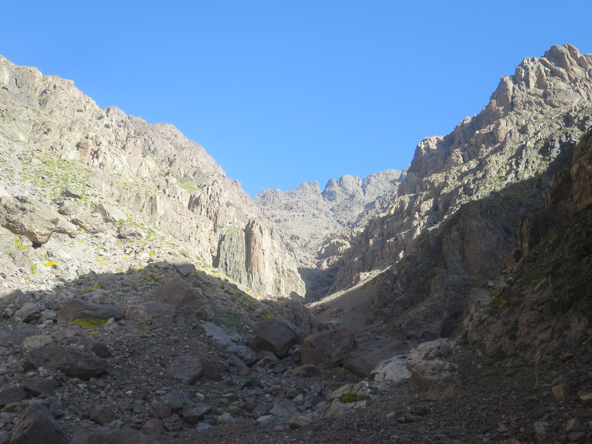 Sehr zeitig am frühen Morgen verließen wir diesen idyllischen Lagerplatz am See – die Morgenstimmung am See war unbeschreiblich schön – Doch uns erwartete ein langer Anstieg durch die Ouanoums-Schlucht bis zum 3.680 m hoch gelegenen Tizi n’Ouanoums. Der Weg dorthin war eindrucksvoll und führte stetig, teilweise in steilen Serpentinen, nach oben – Im oberen Teil des Aufstieges entdeckten wir einige (endemische) alpine Pflanzen. Vom Pass hatten wir einen wunderbaren Ausblick auf die zurückgelegte Strecke, den weit unter uns liegenden See und die umliegenden Viertausender des westlichen Hohen Atlas. In einer windgeschützten Nische am Pass gab es ein Mittagessen in Form eines Döners. Was für ein Komfort, ein Mittagessen liebevoll serviert in fast 3700 Metern Höhe! Über einen steilen Serpentinenpfad mit teilweise rutschigem Untergrund ging es hinunter zum Hochtal, in dem auch das Toubkal Base Camp (3.200 m) liegt. Ganz in der Nähe der beiden Berghütten befand sich unser Camp für die nächsten 2 Nächte. In den Hütten konnten wir uns bei einer heißen Dusche entspannen – Was für eine Wohltat nach der Katzenwäsche der letzten Tage. Von unserem Trekkingkoch Achmed und seiner Crew wurden wir mit einem feinen Abendessen (Spaghetti) verwöhnt. Diesmal legten wir uns sehr früh schlafen, denn am nächsten Morgen stand die Gipfeltour auf dem Programm.