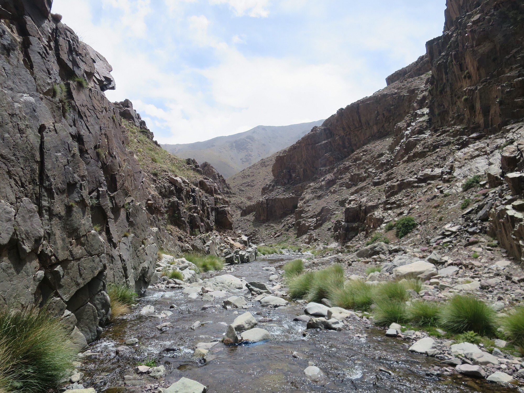 Nach einer etwas durchwachsenen Nacht weckte ein Frühstück wieder unsere müden Lebensgeister. Danach ging es gleich bergauf bis zum Tizi n’Boukchout (2.976 m), wir von sehr kühlen Temperaturen und einem starken Wind empfangen wurden – Zum ersten Mal hatten wir einen wunderbaren Ausblick auf die ersten Viertausender und das gesamte Toubkal-Massiv mit dem höchsten Berg Nordafrikas, dem Djebel Toubkal (4.167m) – Der höchste Berg von Marokko präsentierte sich an diesem Tag mit Neuschnee. Hier hat die Natur ein wahres Farbenspiel für uns vorbereitet: im durchwanderten Gebiet variierten die Farben des Gesteins zwischen rot, schwarz, weiß und grün. Sie werden beeinflusst durch verschiedene Metalle und Mineralien wie z.B. Eisen, Kupfer oder Ton. Nachdem wir die Aussicht ausgiebig genossen haben, ging es wieder bergab zu einem Fluss – Wie bereits am Vortag gab es wieder eine Flusswanderung, diesmal waren allerdings keine Trekkingsandalen nötig, aber dennoch eine gewisse Trittsicherheit und Geschicklichkeit beim Springen von Stein zu Stein im Flussbett 😊 Wir verließen wieder das idyllische Flusstal, bei Stallungen von Nomaden gab es ein liebevoll zubereitendes Mittagessen. Danach ging es mit leichter Steigung im Tal entlang, bis wir unseren Lagerplatz bei der Azib Ourai erreichen, einem Hochtal auf fast 3000 Metern. Nach einem reichhaltigen Abendessen legten wir uns bald schlafen.