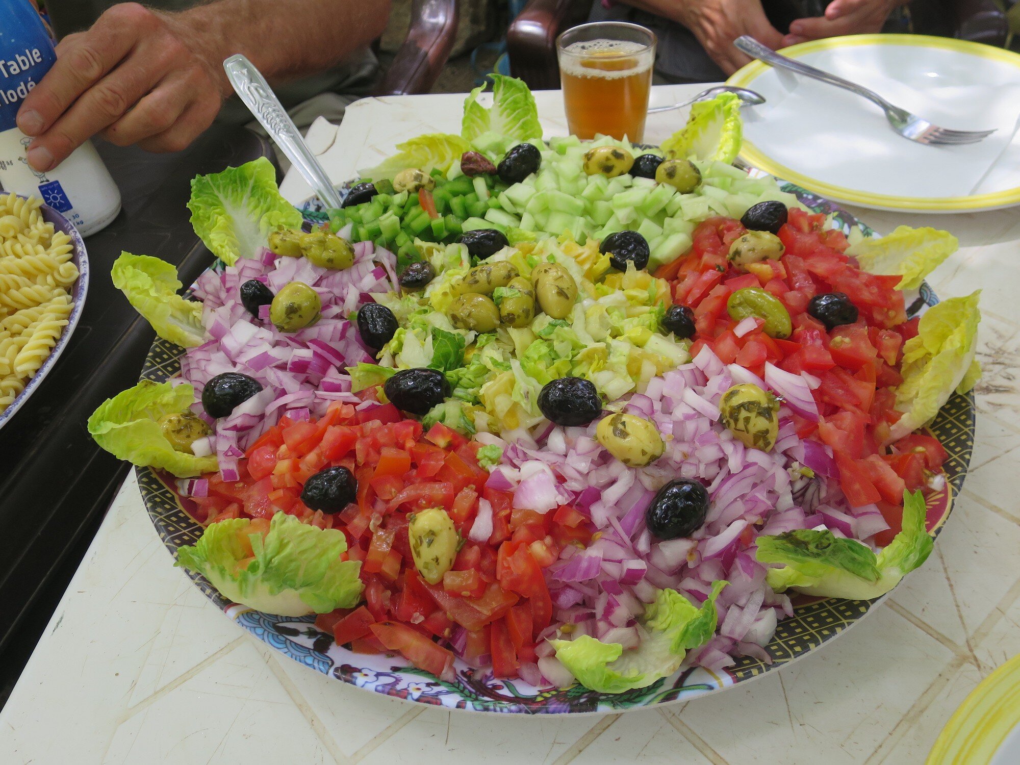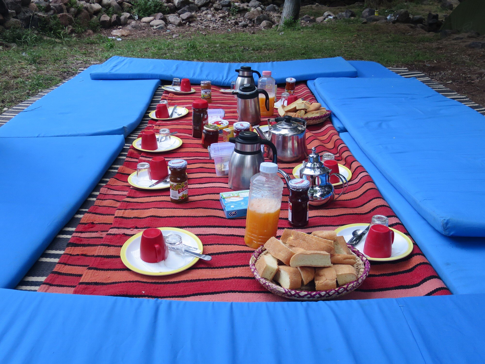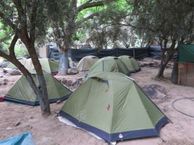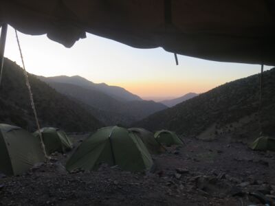 Im Anschluss ging es mit einem Transferbus ins Atlasgebirge. Die Fahrt dauerte ca. 1,5 Stunden und führte uns bis unterhalb des Dorfes Azgour. Die letzten 4 Km liefen wir entlang der Straße bis zu unserem 1. Lagerplatz – Es folgte ein leckeres Abendessen und wir lernten unsere Begleitmannschaft kennen. Danach folgte die erste Nacht im Zelt.