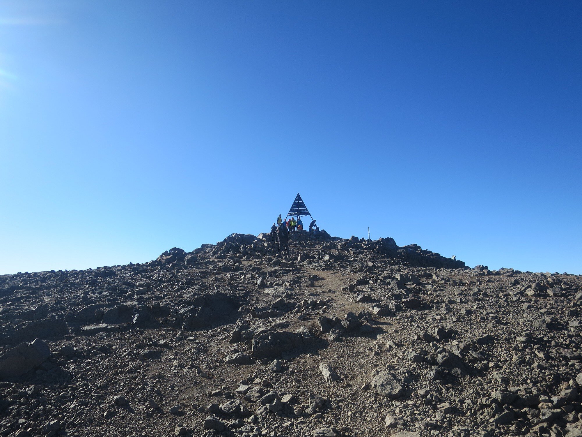 Heute war frühes Aufstehen angesagt und das nach einer etwas durchwachsenen Nacht – Nicht primär, wie vermutet wegen der Schlafhöhe auf 3200 Metern, sondern eher wegen einem Militärcamp in unmittelbarer Nähe zu unserem Lagerplatz. Ca. 80 Rekruten wurden lange vor unserer Abmarschzeit mit lauten Trillerpfeifen geweckt, so dass natürlich auch unsere kurze Nachtruhe jäh unterbrochen wurde…Doch unsere Vorfreude auf die heutige Gipfelbesteigung ließ die Müdigkeit schnell vergessen. Nach einem kurzen Frühstück marschierten wir gegen 5:00 Uhr los. Der Weg auf das Dach von Nordafrika und Marokko ist technisch recht einfach, führte meistens über Schotter- und Geröllfelder ohne Kletterstellen. Nach gut 3,5 Stunden erreichten wir den Gipfel, mit der Höhe von über 4000 Metern hatten wir aufgrund der Akklimatisation der letzten Tage keine Probleme. Von hier bot sich ein phantastischer Rundblick auf die umliegenden Gipfel und Täler. Alle sieben Viertausender des Hohen Atlas waren zu sehen! Und selbst die Haouz-Ebene im Norden und den Antiatlas im Süden. Wir feierten unseren Triumph bei der Gipfelpyramide – Wir haben den ersten außereuropäischen Länderhöhepunkt bestiegen! Ein Gruppenfoto mit Marokko-Fahne durfte natürlich auch nicht fehlen. Nachdem wir dieses beeindruckende Panorama ausreichend genossen hatten, ging es an den Abstieg. Nach ca. 2,5 Stunden erreichten wir wieder unseren Lagerplatz, wo das Mittagessen auf uns wartete. Der Rest des Tages diente zur Erholung: Wir gönnten uns ein kühles Getränk (natürlich alkoholfrei) in einer der beiden Hütten und/oder eine heiße Dusche.