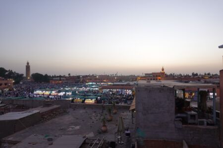 Unser gemeinsamer Easyjet-Flug ab Basel verlief reibungslos, wohlbehalten landeten wir am Flughafen von Marrakesch-Menara. Bereits am Ausgang wurden wir von unserem Taxifahrer erwartet – Die Fahrt in die trubelige Medina (Altstadt) konnte starten. Das letzte Wegstück zu unserer landestypischen Unterkunft legten wir zu Fuß zurück (unsere Gepäck wurden mit einer Handkarre transportiert). Im Riad Andalla wurden wir herzlich empfangen, nach dem Zimmerbezug gab es auf der aussichtsreichen Dachterrasse ein feines Abendessen (Tajine: https://de.wikipedia.org/wiki/Tajine). Wir genossen diese tolle Atmosphäre und unterhielten uns intensiv mit Zakaria, unserem Guide für die gesamte Trekking-Tour. Wir bestaunten einen wunderschönen Sonnenuntergang über den Dächern von Marrakesch und konnten das lebhafte Treiben auf dem Djemaa el Fna – dem Gauklerplatz – von oben bestaunen.