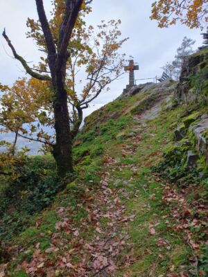 Die wohlverdiente Rast fand auf dem Kräherbauernhof statt, einer Oase mit Kaffee und Kuchen. Frisch gestärkt, führte der Weg in ein ständiges Auf und Ab, bis der Höhepunkt der Tour erreicht wurde: der Transalpine Felsenpfad. Hier war Trittsicherheit unumgänglich, denn der Pfad schlängelte sich über Schroffen und Felsvorsprünge. Die Felsen, in ihren skurilsten Formen, boten ein neues, atemberaubendes Panorama. An der Immelsbacherhöhe (774 m) markierte das Gipfelkreuz einen unvergesslichen Aussichtspunkt über die weite Landschaft.