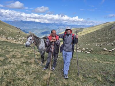 Der Höhepunkt der Wanderung war zweifellos die Etappe über den Tschchunteri-Pass (2750 m) zum Dorf Iprali. Wir liefen am größten Tetnuldi-Gletscher vorbei und dann kam der Moment, der uns besonders in Erinnerung bleiben wird: die Überquerung des reißenden Bergbachs – mit dem Pferd! Abhängig vom Wetter war der Fluss wild und trüb. Die logistische Meisterleistung, unser Hauptgepäck per Auto transportiert zu wissen, während wir mit leichtem Tagesrucksack über diese atemberaubenden Pässe liefen, machte das Erlebnis perfekt.