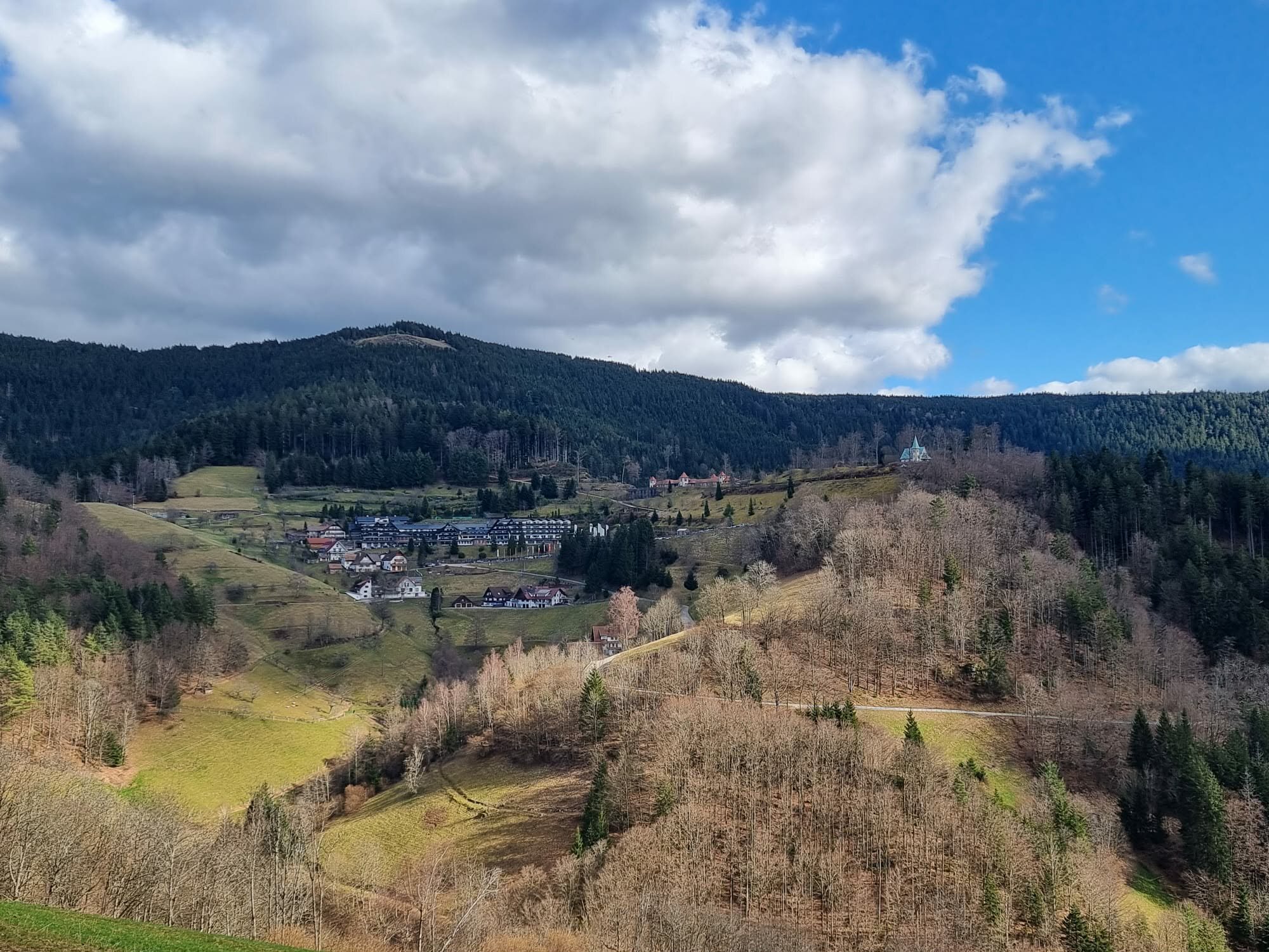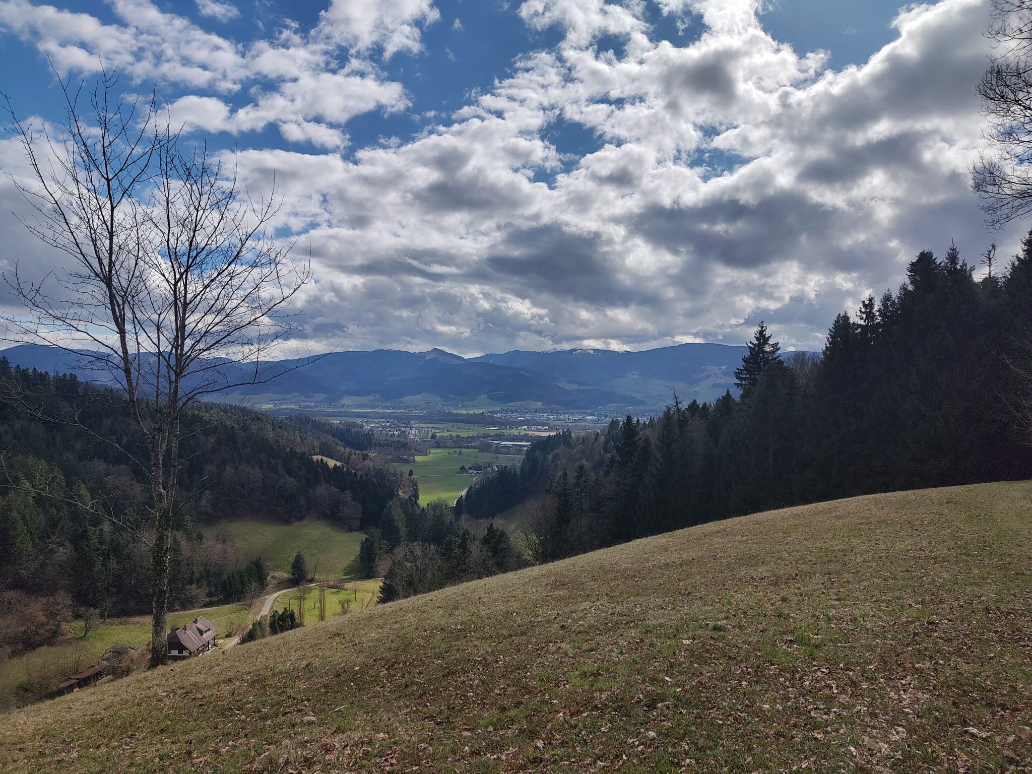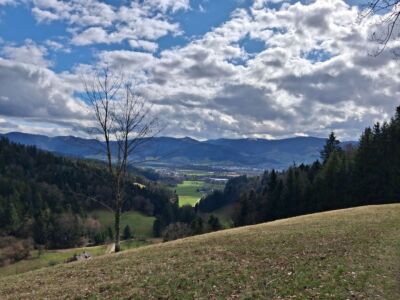 Der Abstieg führte uns am Hanissenhof und Baldenwegerhof vorbei. Der Baldenwegerhof ist ein Erlebnisbauernhof mit Hofladen, Picknickmöglichkeiten und Spielplatz.Unterwegs bietet die Wanderung immer wieder schöne Aussichten ins idyllische Steurental und Dreisamtal. Auch der Feldberg mit Schnee war gut zu sehen.