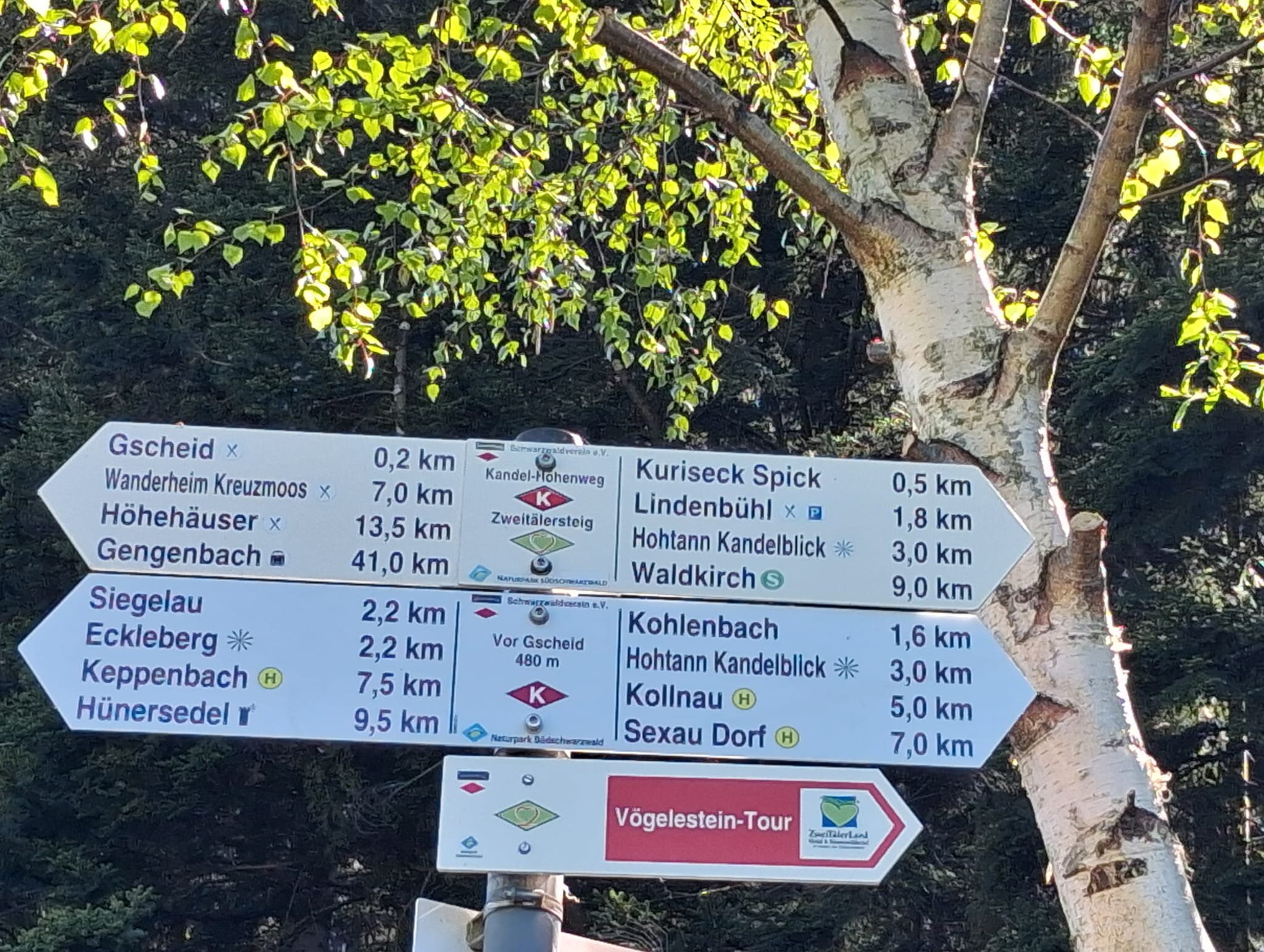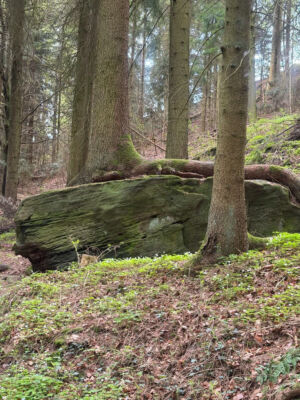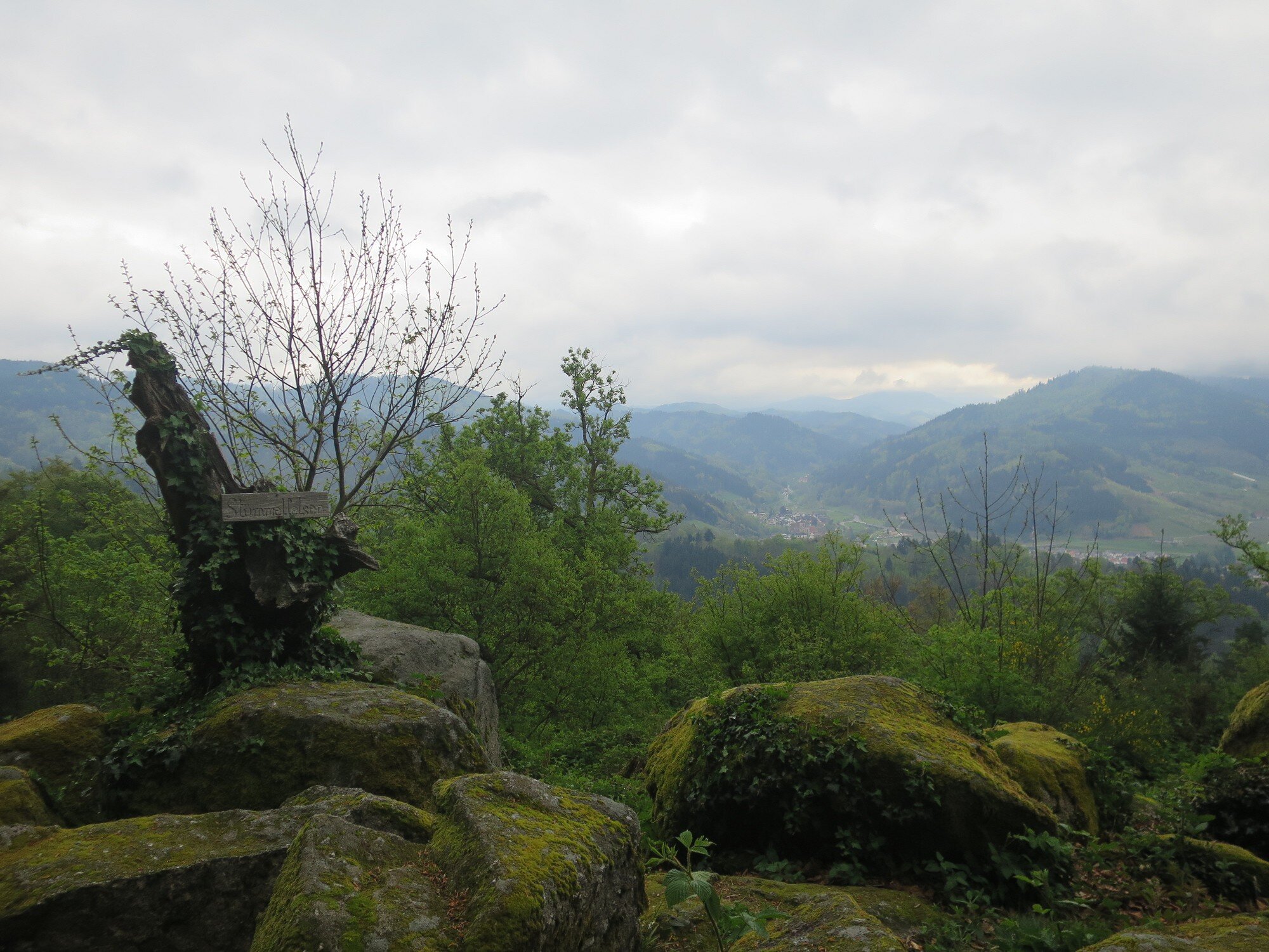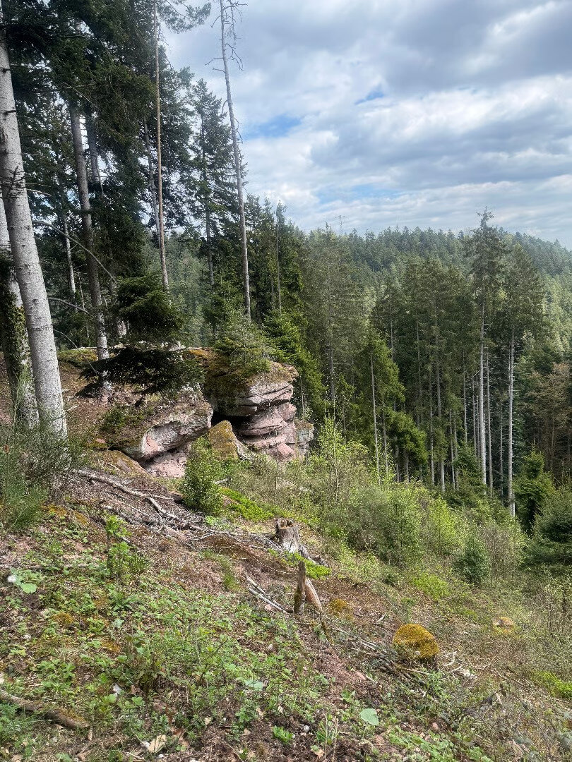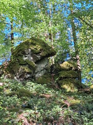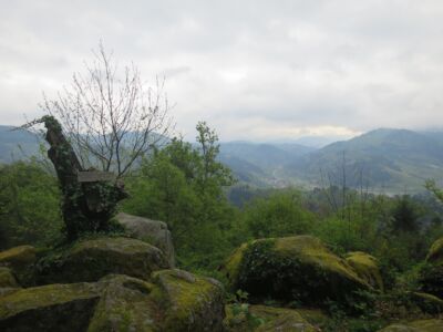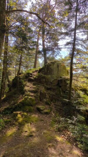 Vom Bahnhof in Gutach ging es ein Stück die Elz entlang. Nun ging es steil bergan. Erst ein Stück Straße und dann in den Wald. Mit teilweise starken Anstiegen erreichten wir den Vögelestein. Von unten könnte man es als ein schlafendes Vögelein interpretieren. Wenn man oben angekommen ist, sind es halt Felsen. 🤣